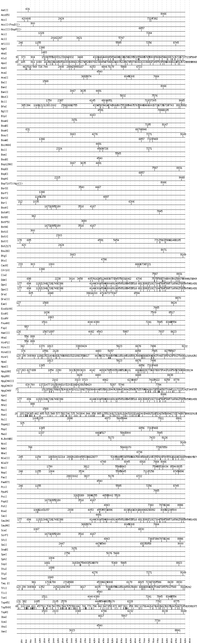Uncut enzymes: AfeI, AflII, AlwI, AlwNI, Aor51HI(Eco47III), ApaI, ApaLI, AscI, AvrII, BaeI, BamHI, BbsI, BbvI, BcgI, BciVI, BglI, BmrI, BpmI, BsaI, BsaXI, BseRI, BsgI, BsiEI, BsiWI, BsmAI, BsmBI, BsmFI, BspMI, BsrBI, BssHII, BssSI, BstEII, BtrI, DrdI, EagI, EarI, EciI, EcoNI, FauI, FokI, FseI, HaeII, HgaI, HphI, I-CeuI, I-SceI, KasI, MboII, MluI, MlyI, MnlI, NaeI, , NarI, NciI, NgoMIV, NotI, NruI, PI-PspI, PI-SceI(VDE), PflFI, PflMI, PleI, PmeI, PmlI, PshAI, PspOMI, PvuI, PvuII, RsrII, SacII, SalI, SapI, SbfI, SexAI, SfaNI, SfiI, SfoI, SgrAI, SmaI, Tth111I, XmaI