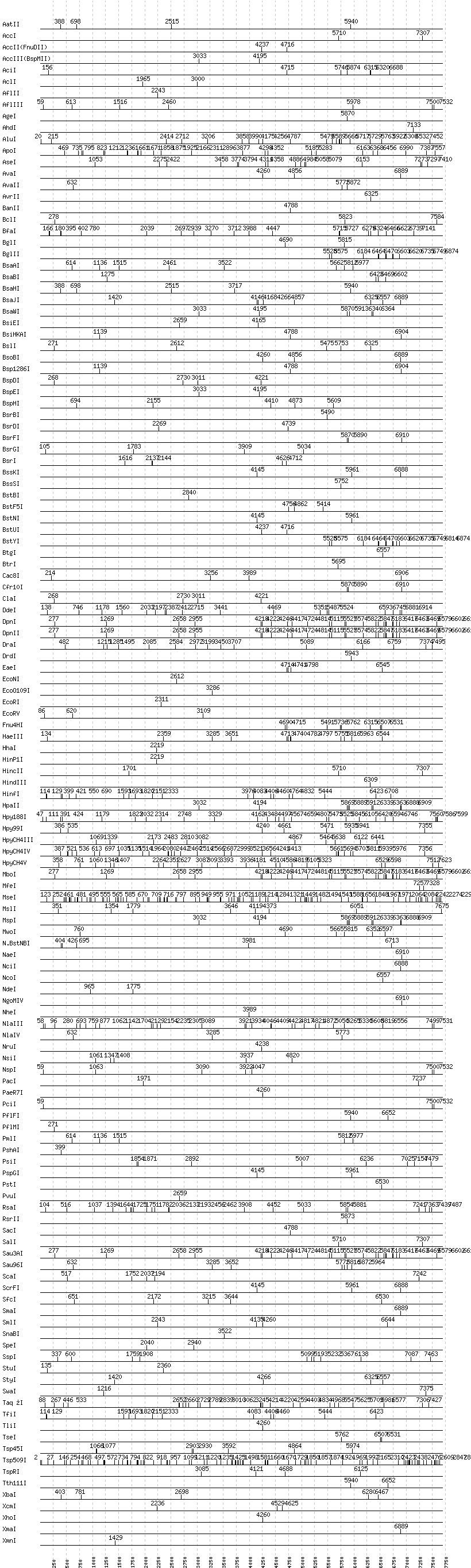 Uncut enzymes: Acc65I, AfeI, AlwI, AlwNI, Aor51HI(Eco47III), ApaI, ApaLI, AscI, BaeI, BalI, BamHI, BanI, BbsI, BbvCI, BbvI, BcgI, BciVI, BlpI, BmrI, BpmI, BsaI, BsaXI, BseRI, BsgI, BsiWI, BsmAI, BsmBI, BsmFI, BsmI, BspMI, BspT107I(HgiCI), BssHII, BstAPI, BstEII, BstXI, BstZ17I, Bsu36I, BtsI, DraIII, EagI, EarI, EciI, FauI, FokI, FseI, FspI, HaeII, HgaI, HpaI, HphI, I-CeuI, I-SceI, KasI, KpnI, MboII, MluI, MlyI, MnlI, MscI, MspA1I, , NarI, NotI, PI-PspI, PI-SceI(VDE), PleI, PmeI, PpuMI, PspOMI, PvuII, SacII, SapI, SbfI, SexAI, SfaNI, SfiI, SfoI, SgrAI, SphI