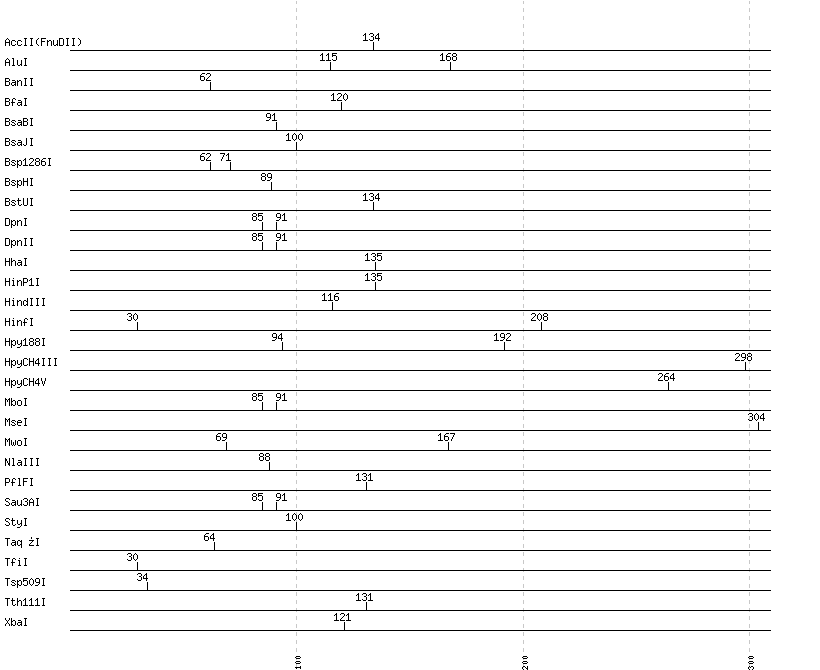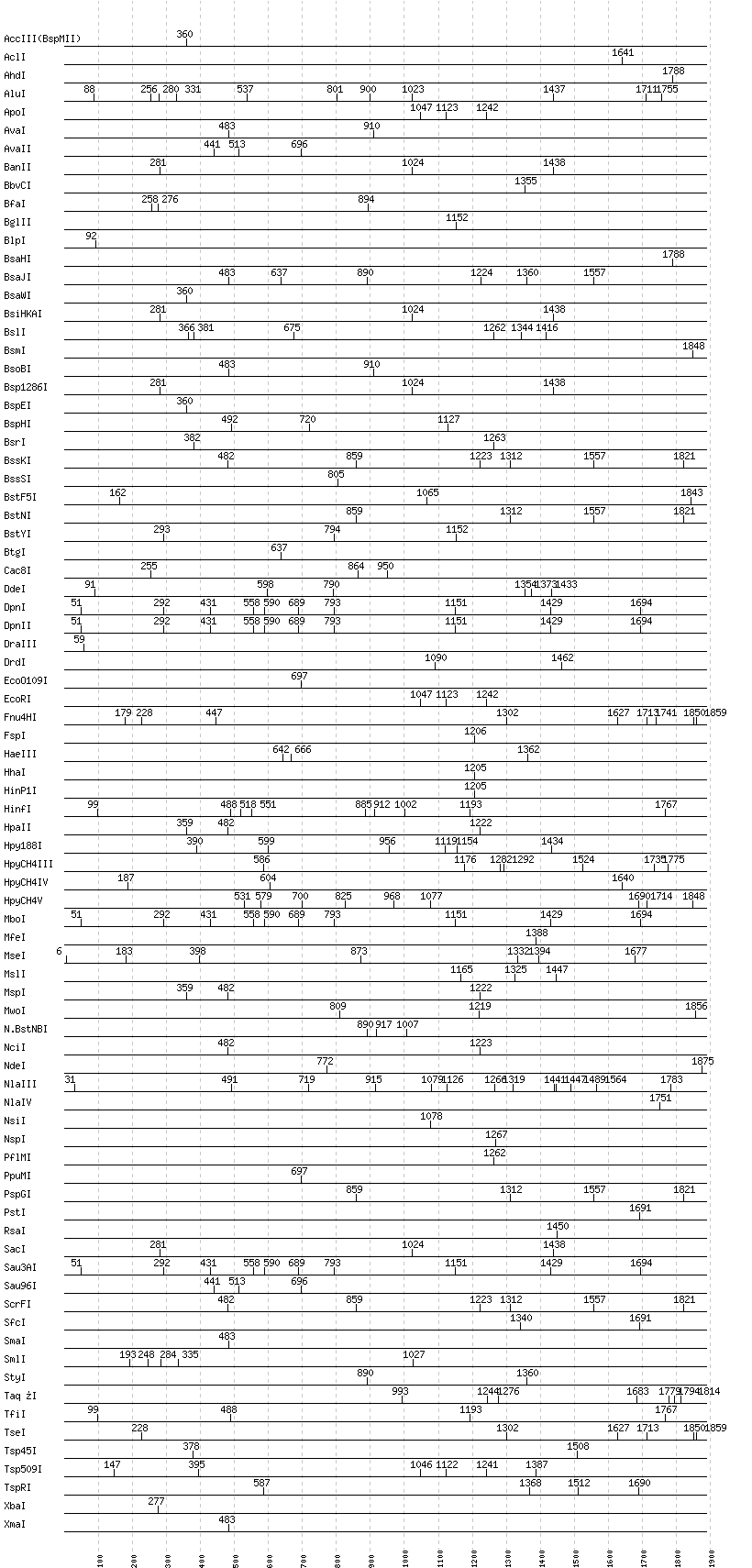 Uncut enzymes: AatII, Acc65I, AccI, AccIII(BspMII), AciI, AclI, AfeI, AflII, AflIII, AgeI, AhdI, AlwI, AlwNI, Aor51HI(Eco47III), ApaI, ApaLI, ApoI, AscI, AseI, AvaI, AvaII, AvrII, BaeI, BalI, BamHI, BanI, BbsI, BbvCI, BbvI, BcgI, BciVI, BclI, BglI, BglII, BlpI, BmrI, BpmI, BsaAI, BsaHI, BsaI, BsaWI, BsaXI, BseRI, BsgI, BsiEI, BsiHKAI, BsiWI, BslI, BsmAI, BsmBI, BsmFI, BsmI, BsoBI, BspDI, BspEI, BspMI, BspT107I(HgiCI), BsrBI, BsrDI, BsrFI, BsrGI, BsrI, BssHII, BssKI, BssSI, BstAPI, BstBI, BstEII, BstF5I, BstNI, BstXI, BstYI, BstZ17I, Bsu36I, BtgI, BtrI, BtsI, Cac8I, Cfr10I, ClaI, DdeI, DraI, DraIII, DrdI, EaeI, EagI, EarI, EciI, EcoNI, EcoO109I, EcoRI, EcoRV, FauI, Fnu4HI, FokI, FseI, FspI, HaeII, HaeIII, HgaI, HincII, HpaI, HpaII, HphI, Hpy99I, HpyCH4IV, I-CeuI, I-SceI, KasI, KpnI, MboII, MfeI, MluI, MlyI, MnlI, MscI, MslI, MspA1I, MspI, N.BstNBI, NaeI, , NarI, NciI, NcoI, NdeI, NgoMIV, NheI, NlaIV, NotI, NruI, NsiI, NspI, PI-PspI, PI-SceI(VDE), PacI, PaeR7I, PciI, PflMI, PleI, PmeI, PmlI, PpuMI, PshAI, PsiI, PspGI, PspOMI, PstI, PvuI, PvuII, RsaI, RsrII, SacI, SacII, SalI, SapI, Sau96I, SbfI, ScaI, ScrFI, SexAI, SfaNI, SfcI, SfiI, SfoI, SgrAI, SmaI, SmlI, SnaBI, SpeI, SphI, SspI, StuI, SwaI, TliI, TseI, Tsp45I, TspRI, XcmI, XhoI, XmaI, XmnI