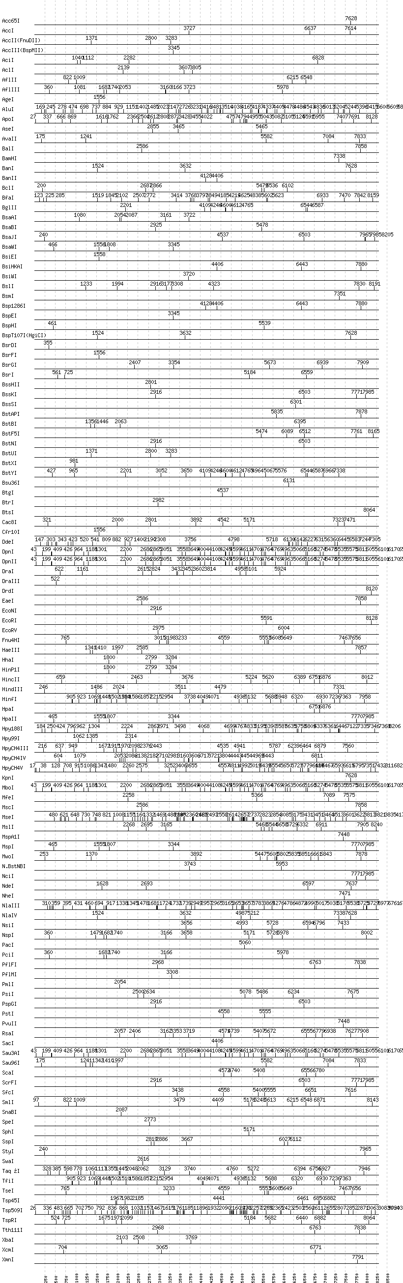 Uncut enzymes: AatII, AfeI, AhdI, AlwI, AlwNI, Aor51HI(Eco47III), ApaI, ApaLI, AscI, AvaI, AvrII, BaeI, BbsI, BbvCI, BbvI, BcgI, BciVI, BglI, BlpI, BmrI, BpmI, BsaHI, BsaI, BsaXI, BseRI, BsgI, BsmAI, BsmBI, BsmFI, BsoBI, BspDI, BspMI, BsrBI, BstEII, BstZ17I, ClaI, EagI, EarI, EciI, EcoO109I, FauI, FokI, FseI, FspI, HaeII, HgaI, HphI, I-CeuI, I-SceI, KasI, MboII, MluI, MlyI, MnlI, NaeI, , NarI, NcoI, NgoMIV, NotI, NruI, PI-PspI, PI-SceI(VDE), PaeR7I, PleI, PmeI, PpuMI, PshAI, PspOMI, PvuI, RsrII, SacII, SalI, SapI, SbfI, SexAI, SfaNI, SfiI, SfoI, SgrAI, SmaI, StuI, TliI, XhoI, XmaI