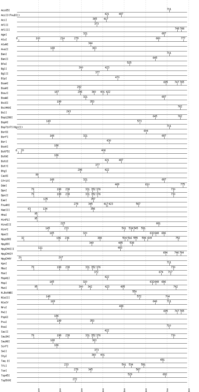 Uncut enzymes: AatII, AccI, AccIII(BspMII), AclI, AfeI, AhdI, AlwI, Aor51HI(Eco47III), ApaI, ApaLI, ApoI, AscI, AseI, AvaI, AvrII, BaeI, BalI, BamHI, BbsI, BbvCI, BbvI, BcgI, BciVI, BclI, BmrI, BpmI, BsaBI, BsaI, BsaXI, BseRI, BsgI, BsiWI, BsmAI, BsmBI, BsmFI, BsmI, BsoBI, BspDI, BspEI, BspMI, BsrBI, BsrGI, BssHII, BssSI, BstAPI, BstBI, BstEII, BstXI, BstZ17I, Bsu36I, BtrI, BtsI, ClaI, DraI, DraIII, DrdI, EagI, EarI, EciI, EcoNI, EcoO109I, EcoRI, EcoRV, FauI, FokI, FseI, FspI, HaeII, HgaI, HincII, HpaI, HphI, I-CeuI, I-SceI, KasI, MboII, MfeI, MluI, MlyI, MnlI, MscI, MslI, NaeI, , NarI, NciI, NcoI, NdeI, NgoMIV, NheI, NotI, NsiI, NspI, PI-PspI, PI-SceI(VDE), PacI, PaeR7I, PciI, PflFI, PflMI, PleI, PmeI, PpuMI, PshAI, PsiI, PspOMI, PstI, PvuII, RsrII, SacI, SalI, SapI, SbfI, ScaI, SexAI, SfaNI, SfcI, SfiI, SfoI, SgrAI, SmaI, SnaBI, SpeI, SphI, SspI, StuI, SwaI, TliI, TspRI, Tth111I, XbaI, XcmI, XhoI, XmaI, XmnI