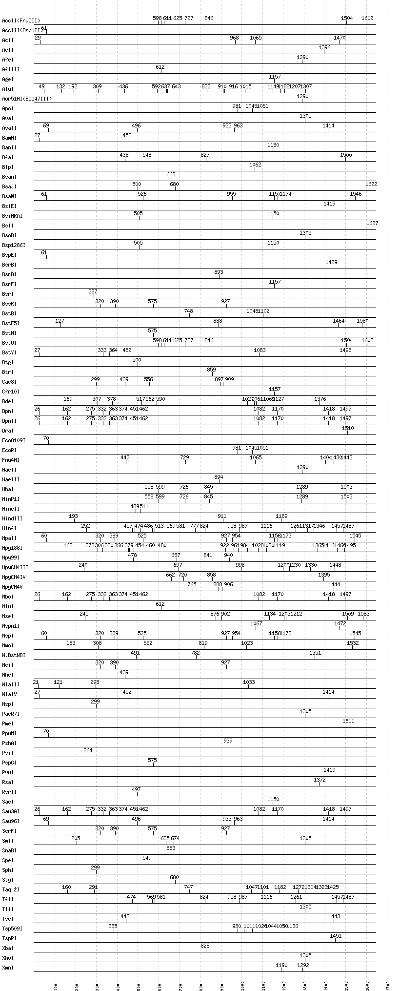 Uncut enzymes: AatII, Acc65I, AccI, AflII, AhdI, AlwI, AlwNI, ApaI, ApaLI, AscI, AseI, AvrII, BaeI, BalI, BanI, BbsI, BbvCI, BbvI, BcgI, BciVI, BclI, BglI, BglII, BmrI, BpmI, BsaBI, BsaHI, BsaI, BsaXI, BseRI, BsgI, BsiWI, BsmAI, BsmBI, BsmFI, BsmI, BspDI, BspHI, BspMI, BspT107I(HgiCI), BsrGI, BssHII, BssSI, BstAPI, BstEII, BstXI, BstZ17I, Bsu36I, BtsI, ClaI, DraIII, DrdI, EaeI, EagI, EarI, EciI, EcoNI, EcoRV, FauI, FokI, FseI, FspI, HgaI, HpaI, HphI, I-CeuI, I-SceI, KasI, KpnI, MboII, MfeI, MlyI, MnlI, MscI, MslI, NaeI, , NarI, NcoI, NdeI, NgoMIV, NotI, NruI, NsiI, PI-PspI, PI-SceI(VDE), PacI, PciI, PflFI, PflMI, PleI, PmlI, PspOMI, PstI, PvuII, SacII, SalI, SapI, SbfI, ScaI, SexAI, SfaNI, SfcI, SfiI, SfoI, SgrAI, SmaI, SspI, StuI, SwaI, Tsp45I, Tth111I, XcmI, XmaI