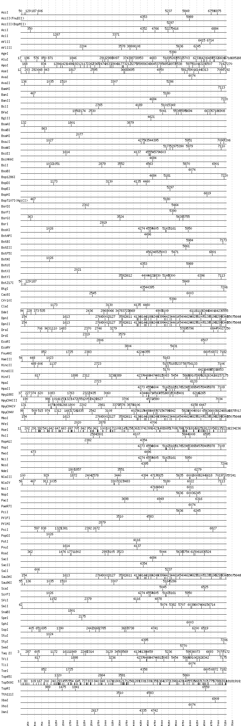 Uncut enzymes: AatII, Acc65I, AfeI, AhdI, AlwI, AlwNI, Aor51HI(Eco47III), ApaI, ApaLI, AscI, AvrII, BaeI, BalI, BbsI, BbvCI, BbvI, BcgI, BciVI, BglI, BlpI, BmrI, BpmI, BsaI, BsaXI, BseRI, BsgI, BsiWI, BsmAI, BsmBI, BsmFI, BsmI, BspMI, BsrBI, BssHII, BssSI, Bsu36I, BtrI, BtsI, DraIII, EaeI, EagI, EarI, EciI, EcoNI, EcoO109I, FauI, FokI, FseI, FspI, HaeII, HgaI, HhaI, HinP1I, HphI, Hpy99I, I-CeuI, I-SceI, KasI, KpnI, MboII, MluI, MlyI, MnlI, MscI, N.BstNBI, NaeI, , NarI, NgoMIV, NheI, NotI, NruI, PI-PspI, PI-SceI(VDE), PleI, PmeI, PmlI, PpuMI, PshAI, PspOMI, PvuII, RsrII, SapI, SbfI, SexAI, SfaNI, SfiI, SfoI, SgrAI, SmaI, XcmI, XmaI