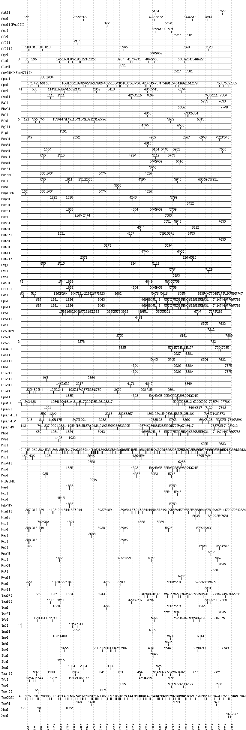 Uncut enzymes: Acc65I, AccIII(BspMII), AclI, AhdI, AlwI, ApaI, AscI, AvaI, AvrII, BaeI, BamHI, BanI, BanII, BbsI, BbvI, BcgI, BciVI, BglI, BmrI, BpmI, BsaI, BsaXI, BseRI, BsgI, BsiWI, BsmAI, BsmBI, BsmFI, BsoBI, BspDI, BspEI, BspMI, BspT107I(HgiCI), BsrBI, BsrGI, BssHII, BssSI, BstAPI, BstEII, BstXI, Bsu36I, ClaI, DrdI, EagI, EarI, EciI, EcoNI, FauI, FokI, FseI, FspI, HgaI, HpaI, HphI, I-CeuI, I-SceI, KasI, KpnI, MboII, MluI, MlyI, MnlI, , NarI, NdeI, NheI, NotI, NruI, PI-PspI, PI-SceI(VDE), PaeR7I, PflFI, PflMI, PleI, PmeI, PshAI, PspOMI, PvuI, SacI, SacII, SalI, SapI, SbfI, SexAI, SfaNI, SfiI, SfoI, SgrAI, SmaI, TliI, Tth111I, XhoI, XmaI, XmnI