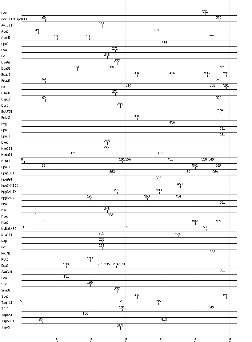 Uncut enzymes: AatII, Acc65I, AccII(FnuDII), AciI, AclI, AfeI, AflII, AgeI, AhdI, AlwI, Aor51HI(Eco47III), ApaI, ApaLI, AscI, AseI, AvaII, AvrII, BaeI, BamHI, BanI, BanII, BbsI, BbvCI, BbvI, BcgI, BciVI, BclI, BfaI, BglI, BglII, BlpI, BmrI, BpmI, BsaHI, BsaI, BsaXI, BseRI, BsgI, BsiEI, BsiHKAI, BsiWI, BsmAI, BsmBI, BsmFI, BsmI, Bsp1286I, BspDI, BspHI, BspMI, BspT107I(HgiCI), BsrBI, BsrDI, BsrFI, BsrGI, BssHII, BssKI, BssSI, BstAPI, BstBI, BstEII, BstNI, BstUI, BstYI, BstZ17I, Bsu36I, BtrI, BtsI, Cac8I, Cfr10I, ClaI, DdeI, DraI, DraIII, DrdI, EagI, EarI, EciI, EcoNI, EcoO109I, EcoRI, EcoRV, FauI, Fnu4HI, FokI, FseI, FspI, HaeII, HgaI, HhaI, HinP1I, HindIII, HpaI, HphI, I-CeuI, I-SceI, KasI, KpnI, MboII, MfeI, MluI, MlyI, MnlI, MslI, MspA1I, MwoI, NaeI, , NarI, NciI, NcoI, NdeI, NgoMIV, NheI, NlaIV, NotI, NruI, NsiI, PI-PspI, PI-SceI(VDE), PacI, PaeR7I, PflFI, PleI, PmeI, PmlI, PpuMI, PshAI, PsiI, PspGI, PspOMI, PvuI, PvuII, RsrII, SacI, SacII, SalI, SapI, Sau96I, SbfI, ScrFI, SexAI, SfaNI, SfiI, SfoI, SgrAI, SmaI, SmlI, SpeI, SphI, SspI, StuI, SwaI, TliI, TseI, Tth111I, XbaI, XcmI, XhoI, XmaI, XmnI