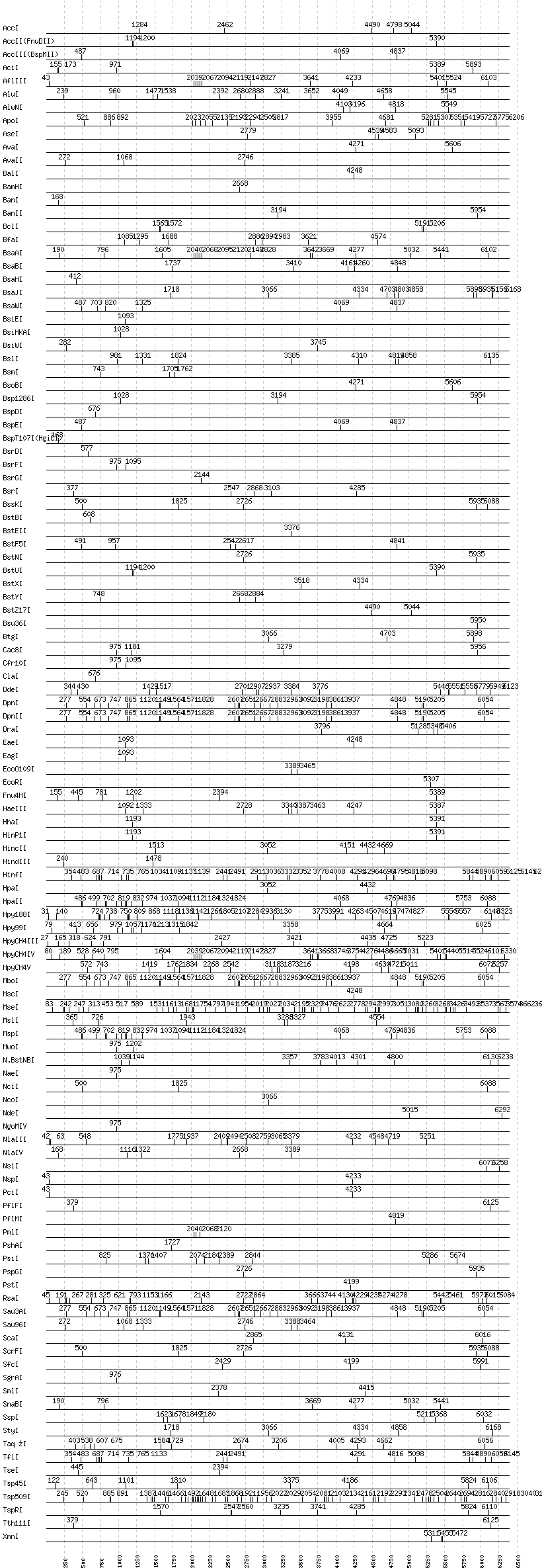 Uncut enzymes: AatII, Acc65I, AclI, AfeI, AflII, AgeI, AhdI, AlwI, Aor51HI(Eco47III), ApaI, ApaLI, AscI, AvrII, BaeI, BbsI, BbvCI, BbvI, BcgI, BciVI, BglI, BglII, BlpI, BmrI, BpmI, BsaI, BsaXI, BseRI, BsgI, BsmAI, BsmBI, BsmFI, BspHI, BspMI, BsrBI, BssHII, BssSI, BstAPI, BtrI, BtsI, DraIII, DrdI, EarI, EciI, EcoNI, EcoRV, FauI, FokI, FseI, FspI, HaeII, HgaI, HphI, I-CeuI, I-SceI, KasI, KpnI, MboII, MfeI, MluI, MlyI, MnlI, MspA1I, , NarI, NheI, NotI, NruI, PI-PspI, PI-SceI(VDE), PacI, PaeR7I, PleI, PmeI, PpuMI, PspOMI, PvuI, PvuII, RsrII, SacI, SacII, SalI, SapI, SbfI, SexAI, SfaNI, SfiI, SfoI, SmaI, SpeI, SphI, StuI, SwaI, TliI, XbaI, XcmI, XhoI, XmaI