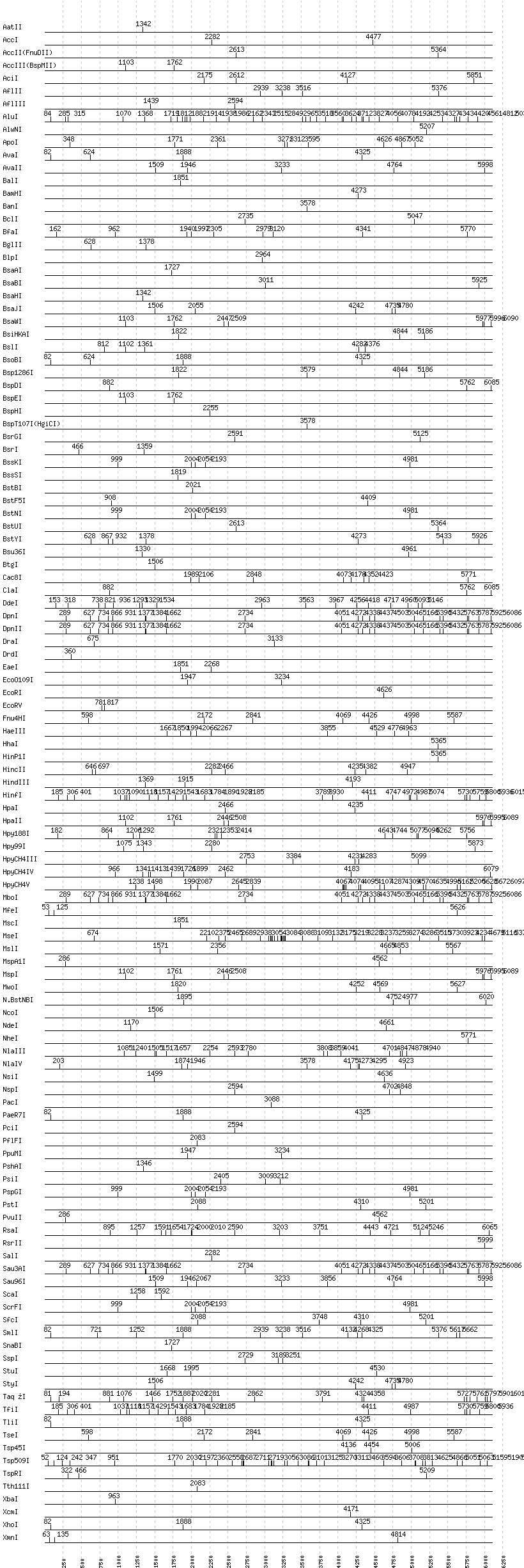 Uncut enzymes: Acc65I, AclI, AfeI, AgeI, AhdI, AlwI, Aor51HI(Eco47III), ApaI, ApaLI, AscI, AseI, AvrII, BaeI, BanII, BbsI, BbvCI, BbvI, BcgI, BciVI, BglI, BmrI, BpmI, BsaI, BsaXI, BseRI, BsgI, BsiEI, BsiWI, BsmAI, BsmBI, BsmFI, BsmI, BspMI, BsrBI, BsrDI, BsrFI, BssHII, BstAPI, BstEII, BstXI, BstZ17I, BtrI, BtsI, Cfr10I, DraIII, EagI, EarI, EciI, EcoNI, FauI, FokI, FseI, FspI, HaeII, HgaI, HphI, I-CeuI, I-SceI, KasI, KpnI, MboII, MluI, MlyI, MnlI, NaeI, , NarI, NciI, NgoMIV, NotI, NruI, PI-PspI, PI-SceI(VDE), PflMI, PleI, PmeI, PmlI, PspOMI, PvuI, SacI, SacII, SapI, SbfI, SexAI, SfaNI, SfiI, SfoI, SgrAI, SmaI, SpeI, SphI, SwaI, XmaI