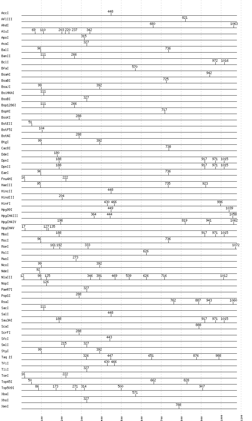 Uncut enzymes: AatII, Acc65I, AccII(FnuDII), AccIII(BspMII), AciI, AclI, AfeI, AflII, AgeI, AlwI, AlwNI, Aor51HI(Eco47III), ApaI, ApaLI, AscI, AseI, AvaII, AvrII, BaeI, BamHI, BanI, BbsI, BbvCI, BbvI, BcgI, BciVI, BglI, BglII, BlpI, BmrI, BpmI, BsaHI, BsaI, BsaWI, BsaXI, BseRI, BsgI, BsiEI, BsiWI, BslI, BsmAI, BsmBI, BsmFI, BsmI, BspDI, BspEI, BspMI, BspT107I(HgiCI), BsrBI, BsrDI, BsrFI, BsrGI, BsrI, BssHII, BssSI, BstAPI, BstBI, BstUI, BstXI, BstYI, BstZ17I, Bsu36I, BtrI, BtsI, Cfr10I, ClaI, DraI, DraIII, DrdI, EagI, EarI, EciI, EcoNI, EcoO109I, EcoRI, EcoRV, FauI, FokI, FseI, FspI, HaeII, HgaI, HhaI, HinP1I, HpaI, HpaII, HphI, Hpy188I, I-CeuI, I-SceI, KasI, KpnI, MboII, MfeI, MluI, MlyI, MnlI, MspA1I, MspI, N.BstNBI, NaeI, , NarI, NciI, NgoMIV, NheI, NlaIV, NotI, NruI, NsiI, PI-PspI, PI-SceI(VDE), PacI, PciI, PflFI, PflMI, PleI, PmeI, PmlI, PpuMI, PshAI, PsiI, PspOMI, PstI, PvuI, PvuII, RsrII, SacII, SapI, Sau96I, SbfI, SexAI, SfaNI, SfiI, SfoI, SgrAI, SmaI, SnaBI, SpeI, SphI, SspI, StuI, SwaI, TspRI, Tth111I, XcmI, XmaI