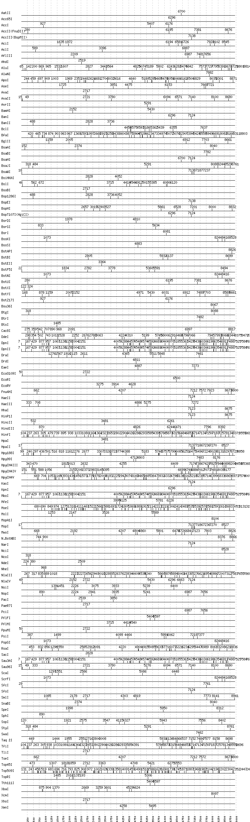 Uncut enzymes: AatII, AccIII(BspMII), AfeI, AgeI, AlwI, Aor51HI(Eco47III), ApaI, ApaLI, AscI, AvrII, BaeI, BamHI, BbsI, BbvCI, BbvI, BcgI, BciVI, BlpI, BmrI, BpmI, BsaI, BsaXI, BseRI, BsgI, BsmAI, BsmBI, BsmFI, BspEI, BspMI, BsrBI, BsrFI, BssHII, BssSI, BstAPI, BstXI, Bsu36I, BtrI, BtsI, Cfr10I, DrdI, EagI, EarI, EciI, EcoNI, FauI, FokI, FseI, FspI, HaeII, HgaI, HphI, I-CeuI, I-SceI, KasI, MboII, MluI, MlyI, MnlI, NaeI, , NarI, NciI, NgoMIV, NheI, NotI, NruI, PI-PspI, PI-SceI(VDE), PflFI, PleI, PmeI, PpuMI, PshAI, PspOMI, PvuI, RsrII, SapI, SbfI, SexAI, SfaNI, SfiI, SfoI, SgrAI, SmaI, SpeI, SphI, SwaI, Tth111I, XcmI, XmaI