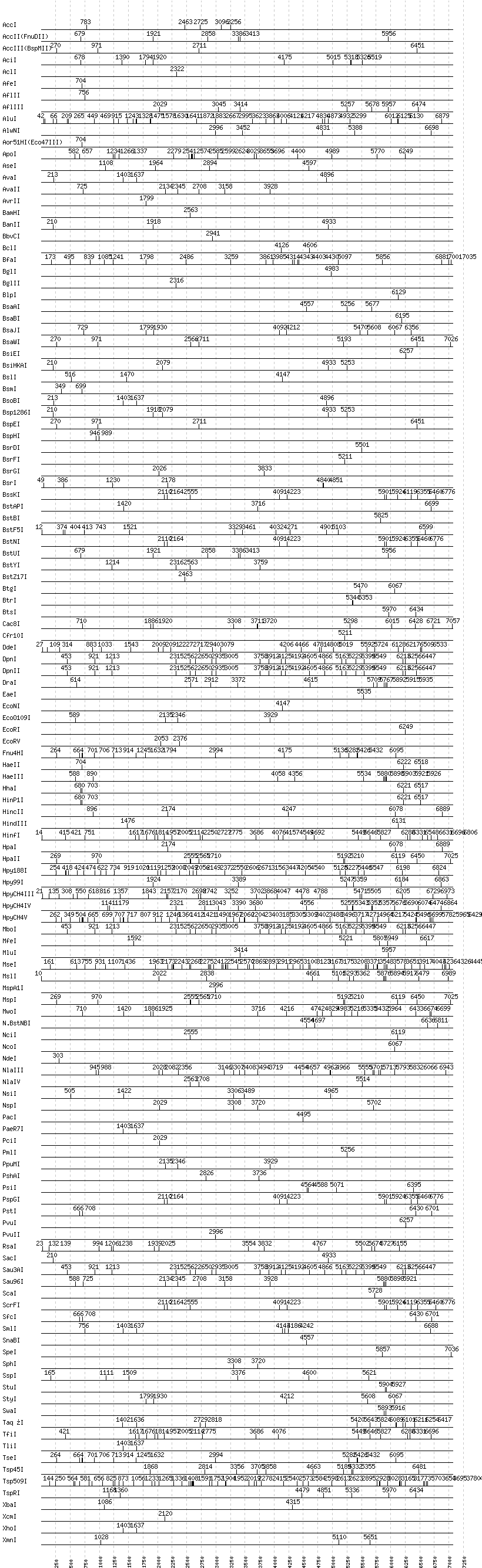 Uncut enzymes: AatII, Acc65I, AgeI, AhdI, AlwI, ApaI, ApaLI, AscI, BaeI, BalI, BanI, BbsI, BbvI, BcgI, BciVI, BmrI, BpmI, BsaHI, BsaI, BsaXI, BseRI, BsgI, BsiWI, BsmAI, BsmBI, BsmFI, BspDI, BspMI, BspT107I(HgiCI), BsrBI, BssHII, BssSI, BstEII, BstXI, Bsu36I, ClaI, DraIII, DrdI, EagI, EarI, EciI, FauI, FokI, FseI, FspI, HgaI, HphI, I-CeuI, I-SceI, KasI, KpnI, MboII, MlyI, MnlI, MscI, NaeI, , NarI, NgoMIV, NheI, NotI, NruI, PI-PspI, PI-SceI(VDE), PflFI, PflMI, PleI, PmeI, PspOMI, RsrII, SacII, SalI, SapI, SbfI, SexAI, SfaNI, SfiI, SfoI, SgrAI, SmaI, Tth111I, XmaI