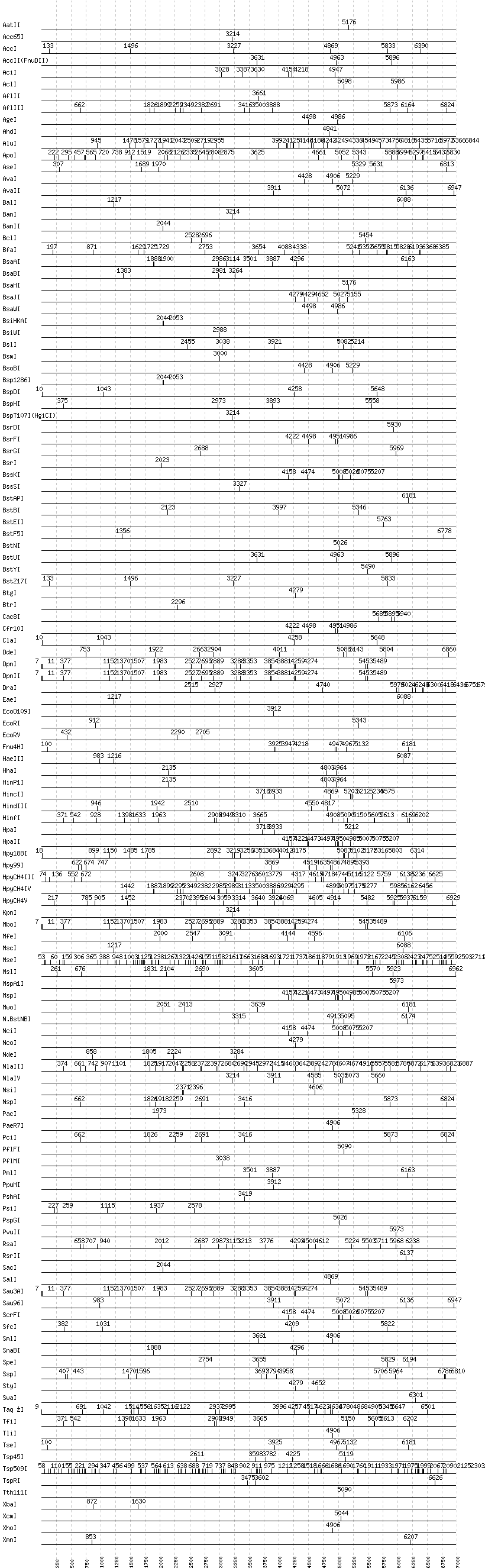 Uncut enzymes: AccIII(BspMII), AfeI, AlwI, AlwNI, Aor51HI(Eco47III), ApaI, ApaLI, AscI, AvrII, BaeI, BamHI, BbsI, BbvCI, BbvI, BcgI, BciVI, BglI, BglII, BlpI, BmrI, BpmI, BsaI, BsaXI, BseRI, BsgI, BsiEI, BsmAI, BsmBI, BsmFI, BspEI, BspMI, BsrBI, BssHII, BstXI, Bsu36I, BtsI, DraIII, DrdI, EagI, EarI, EciI, EcoNI, FauI, FokI, FseI, FspI, HaeII, HgaI, HphI, I-CeuI, I-SceI, KasI, MboII, MluI, MlyI, MnlI, NaeI, , NarI, NgoMIV, NheI, NotI, NruI, PI-PspI, PI-SceI(VDE), PleI, PmeI, PspOMI, PstI, PvuI, SacII, SapI, SbfI, ScaI, SexAI, SfaNI, SfiI, SfoI, SgrAI, SmaI, SphI, StuI, XmaI