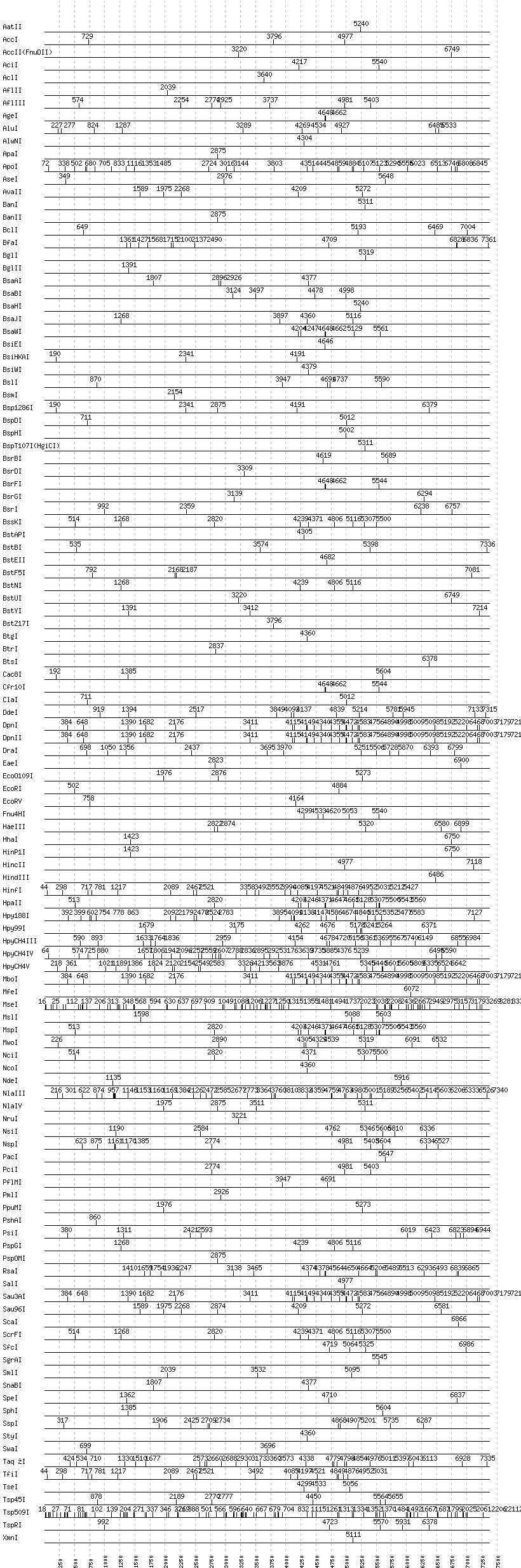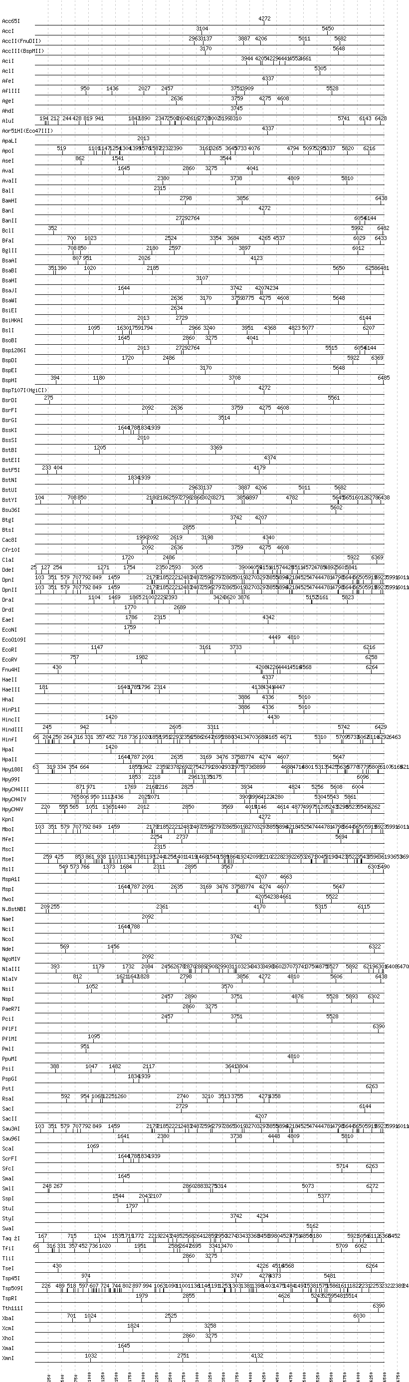 Uncut enzymes: Acc65I, AccIII(BspMII), AfeI, AhdI, AlwI, Aor51HI(Eco47III), ApaLI, AscI, AvaI, AvrII, BaeI, BalI, BamHI, BbsI, BbvCI, BbvI, BcgI, BciVI, BlpI, BmrI, BpmI, BsaI, BsaXI, BseRI, BsgI, BsmAI, BsmBI, BsmFI, BsoBI, BspEI, BspMI, BssHII, BssSI, BstXI, Bsu36I, DraIII, DrdI, EagI, EarI, EciI, EcoNI, FauI, FokI, FseI, FspI, HaeII, HgaI, HpaI, HphI, I-CeuI, I-SceI, KasI, KpnI, MboII, MluI, MlyI, MnlI, MscI, MspA1I, N.BstNBI, NaeI, , NarI, NgoMIV, NheI, NotI, PI-PspI, PI-SceI(VDE), PaeR7I, PflFI, PleI, PmeI, PstI, PvuI, PvuII, RsrII, SacI, SacII, SapI, SbfI, SexAI, SfaNI, SfiI, SfoI, SmaI, StuI, TliI, Tth111I, XbaI, XcmI, XhoI, XmaI