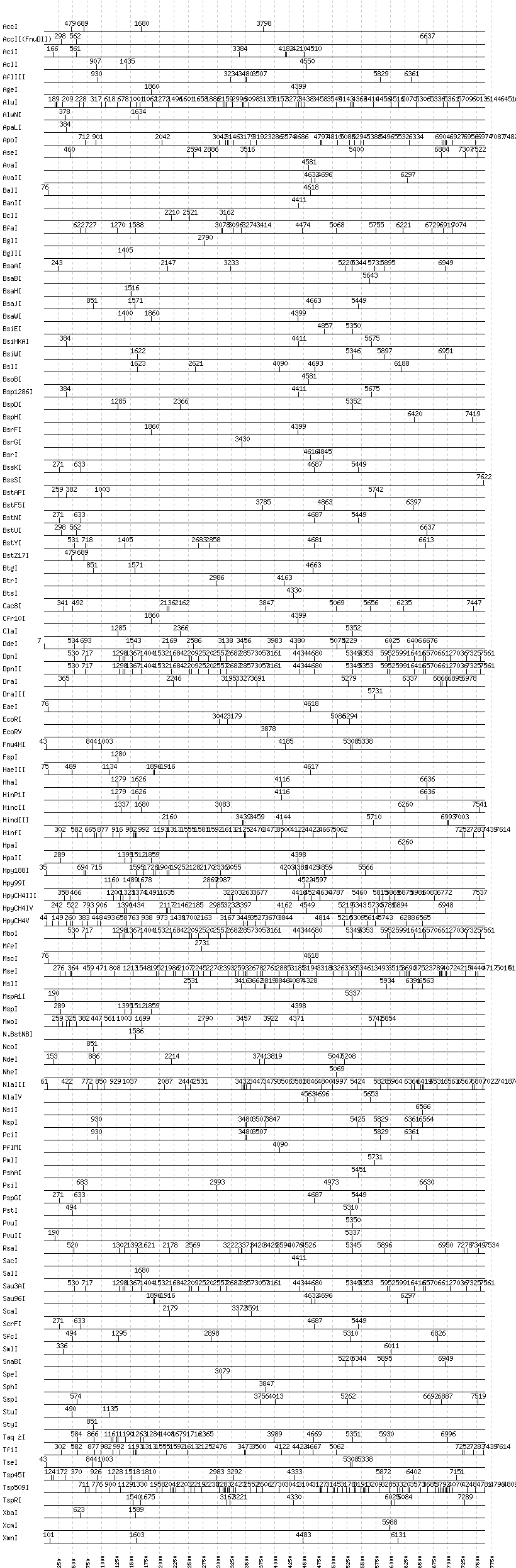 Uncut enzymes: AatII, Acc65I, AccIII(BspMII), AfeI, AflII, AhdI, AlwI, Aor51HI(Eco47III), ApaI, AscI, AvrII, BaeI, BamHI, BanI, BbsI, BbvCI, BbvI, BcgI, BciVI, BlpI, BmrI, BpmI, BsaI, BsaXI, BseRI, BsgI, BsmAI, BsmBI, BsmFI, BsmI, BspEI, BspMI, BspT107I(HgiCI), BsrBI, BsrDI, BssHII, BstBI, BstEII, BstXI, Bsu36I, DrdI, EagI, EarI, EciI, EcoNI, EcoO109I, FauI, FokI, FseI, HaeII, HgaI, HphI, I-CeuI, I-SceI, KasI, KpnI, MboII, MluI, MlyI, MnlI, NaeI, , NarI, NciI, NgoMIV, NotI, NruI, PI-PspI, PI-SceI(VDE), PacI, PaeR7I, PflFI, PleI, PmeI, PpuMI, PspOMI, RsrII, SacII, SapI, SbfI, SexAI, SfaNI, SfiI, SfoI, SgrAI, SmaI, SwaI, TliI, Tth111I, XhoI, XmaI