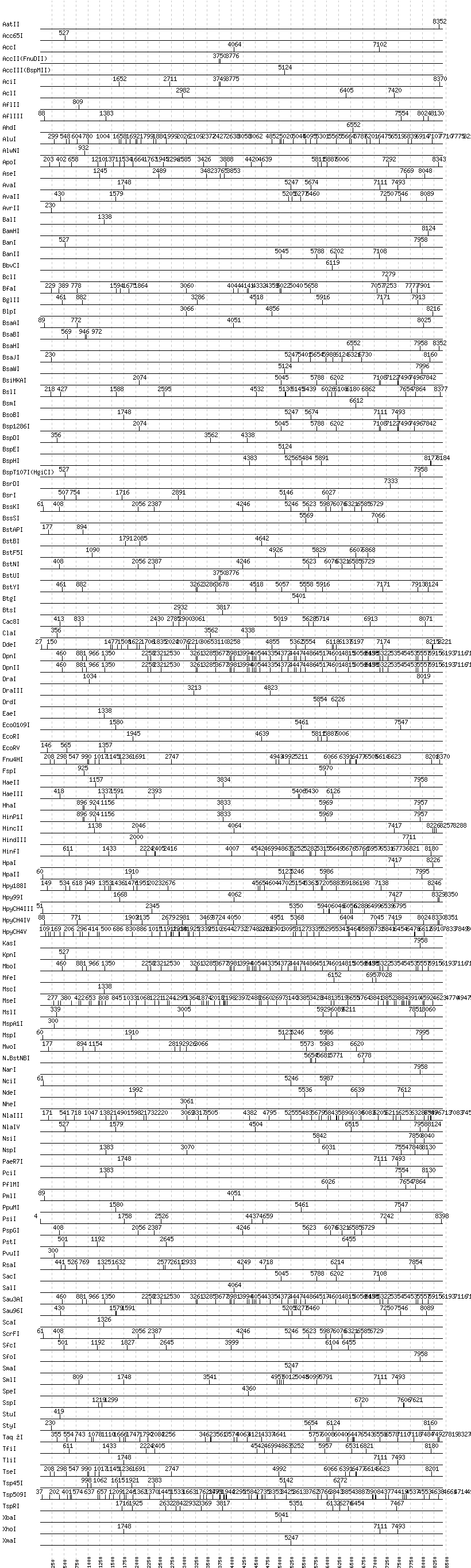 Uncut enzymes: AfeI, AgeI, AlwI, Aor51HI(Eco47III), ApaI, ApaLI, AscI, BaeI, BbsI, BbvI, BcgI, BciVI, BglI, BmrI, BpmI, BsaI, BsaXI, BseRI, BsgI, BsiEI, BsiWI, BsmAI, BsmBI, BsmFI, BspMI, BsrBI, BsrFI, BsrGI, BssHII, BstEII, BstXI, BstZ17I, Bsu36I, BtrI, Cfr10I, EagI, EarI, EciI, EcoNI, FauI, FokI, FseI, HgaI, HphI, I-CeuI, I-SceI, MboII, MluI, MlyI, MnlI, NaeI, , NcoI, NgoMIV, NotI, NruI, PI-PspI, PI-SceI(VDE), PacI, PflFI, PleI, PmeI, PshAI, PspOMI, PvuI, RsrII, SacII, SapI, SbfI, SexAI, SfaNI, SfiI, SgrAI, SnaBI, SphI, SwaI, Tth111I, XcmI, XmnI