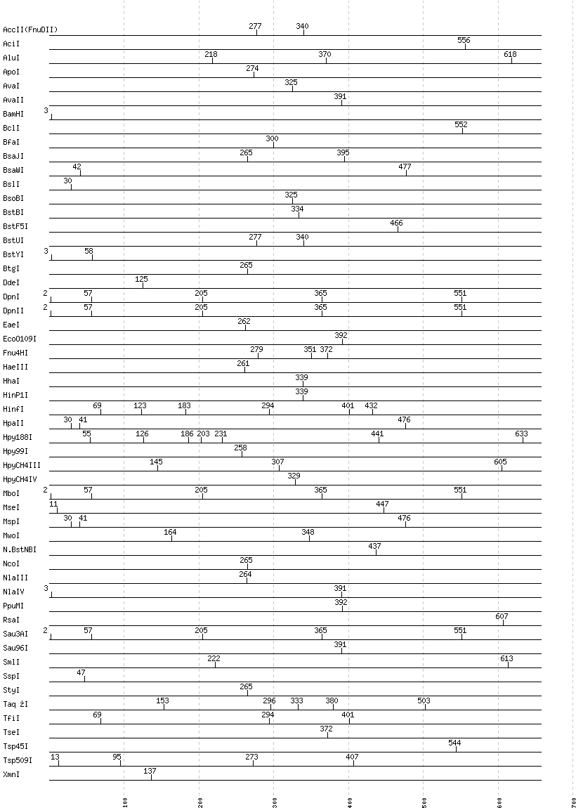 Uncut enzymes: AatII, Acc65I, AccI, AccIII(BspMII), AclI, AfeI, AflII, AflIII, AgeI, AhdI, AlwI, AlwNI, Aor51HI(Eco47III), ApaI, ApaLI, AscI, AseI, AvrII, BaeI, BalI, BanI, BanII, BbsI, BbvCI, BbvI, BcgI, BciVI, BglI, BglII, BlpI, BmrI, BpmI, BsaAI, BsaBI, BsaHI, BsaI, BsaXI, BseRI, BsgI, BsiEI, BsiHKAI, BsiWI, BsmAI, BsmBI, BsmFI, BsmI, Bsp1286I, BspDI, BspEI, BspHI, BspMI, BspT107I(HgiCI), BsrBI, BsrDI, BsrFI, BsrGI, BsrI, BssHII, BssKI, BssSI, BstAPI, BstEII, BstNI, BstXI, BstZ17I, Bsu36I, BtrI, BtsI, Cac8I, Cfr10I, ClaI, DraI, DraIII, DrdI, EagI, EarI, EciI, EcoNI, EcoRI, EcoRV, FauI, FokI, FseI, FspI, HaeII, HgaI, HincII, HindIII, HpaI, HphI, HpyCH4V, I-CeuI, I-SceI, KasI, KpnI, MboII, MfeI, MluI, MlyI, MnlI, MscI, MslI, MspA1I, NaeI, , NarI, NciI, NdeI, NgoMIV, NheI, NotI, NruI, NsiI, NspI, PI-PspI, PI-SceI(VDE), PacI, PaeR7I, PciI, PflFI, PflMI, PleI, PmeI, PmlI, PshAI, PsiI, PspGI, PspOMI, PstI, PvuI, PvuII, RsrII, SacI, SacII, SalI, SapI, SbfI, ScaI, ScrFI, SexAI, SfaNI, SfcI, SfiI, SfoI, SgrAI, SmaI, SnaBI, SpeI, SphI, StuI, SwaI, TliI, TspRI, Tth111I, XbaI, XcmI, XhoI, XmaI