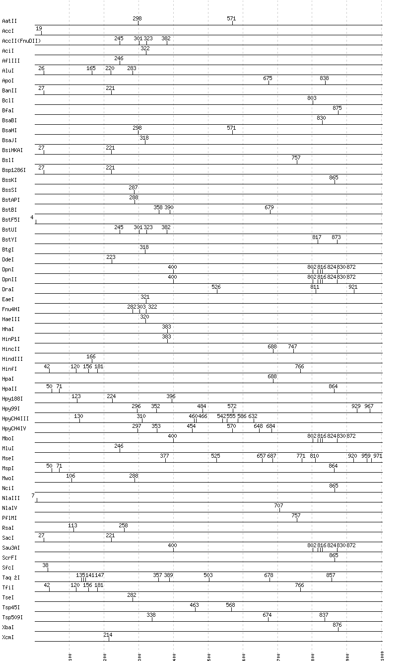 Uncut enzymes: Acc65I, AccIII(BspMII), AclI, AfeI, AflII, AgeI, AhdI, AlwI, AlwNI, Aor51HI(Eco47III), ApaI, ApaLI, AscI, AseI, AvaI, AvaII, AvrII, BaeI, BalI, BamHI, BanI, BbsI, BbvCI, BbvI, BcgI, BciVI, BglI, BglII, BlpI, BmrI, BpmI, BsaAI, BsaI, BsaWI, BsaXI, BseRI, BsgI, BsiEI, BsiWI, BsmAI, BsmBI, BsmFI, BsmI, BsoBI, BspDI, BspEI, BspHI, BspMI, BspT107I(HgiCI), BsrBI, BsrDI, BsrFI, BsrGI, BsrI, BssHII, BstEII, BstNI, BstXI, BstZ17I, Bsu36I, BtrI, BtsI, Cac8I, Cfr10I, ClaI, DraIII, DrdI, EagI, EarI, EciI, EcoNI, EcoO109I, EcoRI, EcoRV, FauI, FokI, FseI, FspI, HaeII, HgaI, HphI, HpyCH4V, I-CeuI, I-SceI, KasI, KpnI, MboII, MfeI, MlyI, MnlI, MscI, MslI, MspA1I, N.BstNBI, NaeI, , NarI, NcoI, NdeI, NgoMIV, NheI, NotI, NruI, NsiI, NspI, PI-PspI, PI-SceI(VDE), PacI, PaeR7I, PciI, PflFI, PleI, PmeI, PmlI, PpuMI, PshAI, PsiI, PspGI, PspOMI, PstI, PvuI, PvuII, RsrII, SacII, SalI, SapI, Sau96I, SbfI, ScaI, SexAI, SfaNI, SfiI, SfoI, SgrAI, SmaI, SmlI, SnaBI, SpeI, SphI, SspI, StuI, StyI, SwaI, TliI, TspRI, Tth111I, XhoI, XmaI, XmnI