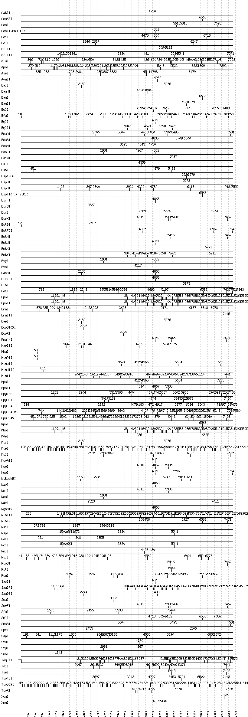 Uncut enzymes: AccIII(BspMII), AfeI, AgeI, AhdI, AlwI, AlwNI, Aor51HI(Eco47III), ApaI, ApaLI, AscI, AvaI, AvrII, BaeI, BbsI, BbvCI, BbvI, BcgI, BciVI, BlpI, BmrI, BpmI, BsaI, BsaWI, BsaXI, BseRI, BsgI, BsiEI, BsiHKAI, BsmAI, BsmBI, BsmFI, BsoBI, BspEI, BspMI, BsrBI, BsrDI, BssHII, BssSI, BstAPI, BstEII, BstZ17I, Bsu36I, BtrI, DrdI, EagI, EarI, EciI, EcoNI, EcoRV, FauI, FokI, FseI, FspI, HaeII, HgaI, HphI, I-CeuI, I-SceI, KasI, MboII, MluI, MlyI, MnlI, , NarI, NheI, NotI, NruI, PI-PspI, PI-SceI(VDE), PaeR7I, PflFI, PflMI, PleI, PmeI, PpuMI, PshAI, PspOMI, PvuI, PvuII, RsrII, SacI, SalI, SapI, SbfI, SexAI, SfaNI, SfiI, SfoI, SgrAI, SmaI, SphI, TliI, Tth111I, XbaI, XhoI, XmaI