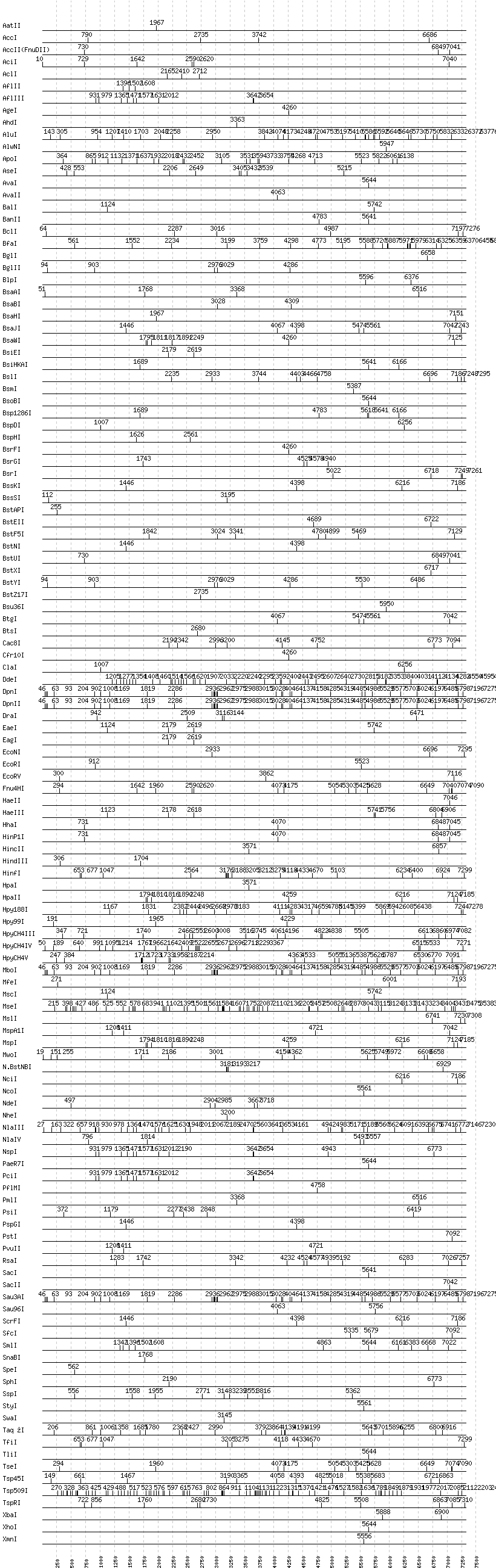Uncut enzymes: Acc65I, AccIII(BspMII), AfeI, AlwI, Aor51HI(Eco47III), ApaI, ApaLI, AscI, AvrII, BaeI, BamHI, BanI, BbsI, BbvCI, BbvI, BcgI, BciVI, BmrI, BpmI, BsaI, BsaXI, BseRI, BsgI, BsiWI, BsmAI, BsmBI, BsmFI, BspEI, BspMI, BspT107I(HgiCI), BsrBI, BsrDI, BssHII, BstBI, BtrI, DraIII, DrdI, EarI, EciI, EcoO109I, FauI, FokI, FseI, FspI, HgaI, HphI, I-CeuI, I-SceI, KasI, KpnI, MboII, MluI, MlyI, MnlI, NaeI, , NarI, NgoMIV, NotI, NruI, NsiI, PI-PspI, PI-SceI(VDE), PacI, PflFI, PleI, PmeI, PpuMI, PshAI, PspOMI, PvuI, RsrII, SalI, SapI, SbfI, ScaI, SexAI, SfaNI, SfiI, SfoI, SgrAI, SmaI, StuI, Tth111I, XcmI, XmaI