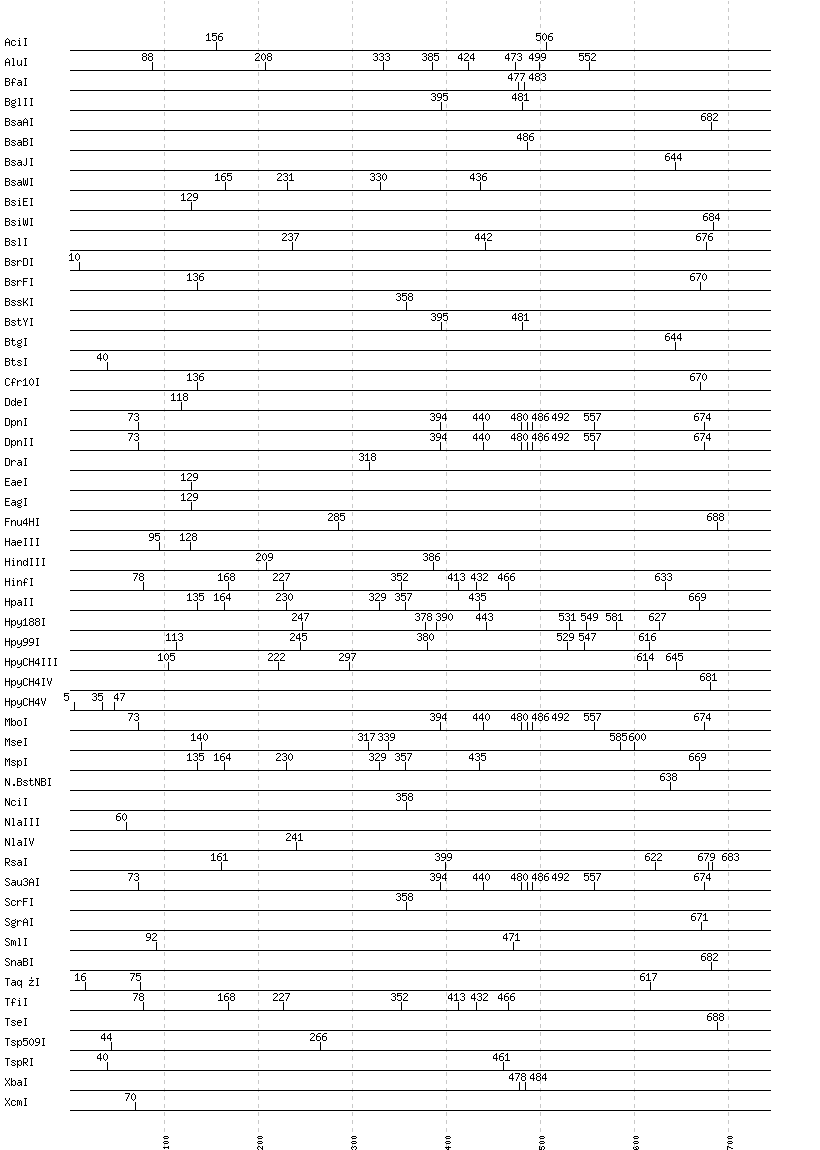 Uncut enzymes: AatII, Acc65I, AccI, AccII(FnuDII), AccIII(BspMII), AclI, AfeI, AflII, AflIII, AgeI, AhdI, AlwI, AlwNI, Aor51HI(Eco47III), ApaI, ApaLI, ApoI, AscI, AseI, AvaI, AvaII, AvrII, BaeI, BalI, BamHI, BanI, BanII, BbsI, BbvCI, BbvI, BcgI, BciVI, BclI, BglI, BlpI, BmrI, BpmI, BsaHI, BsaI, BsaXI, BseRI, BsgI, BsiHKAI, BsmAI, BsmBI, BsmFI, BsmI, BsoBI, Bsp1286I, BspDI, BspEI, BspHI, BspMI, BspT107I(HgiCI), BsrBI, BsrGI, BsrI, BssHII, BssSI, BstAPI, BstBI, BstEII, BstF5I, BstNI, BstUI, BstXI, BstZ17I, Bsu36I, BtrI, Cac8I, ClaI, DraIII, DrdI, EarI, EciI, EcoNI, EcoO109I, EcoRI, EcoRV, FauI, FokI, FseI, FspI, HaeII, HgaI, HhaI, HinP1I, HincII, HpaI, HphI, I-CeuI, I-SceI, KasI, KpnI, MboII, MfeI, MluI, MlyI, MnlI, MscI, MslI, MspA1I, MwoI, NaeI, , NarI, NcoI, NdeI, NgoMIV, NheI, NotI, NruI, NsiI, NspI, PI-PspI, PI-SceI(VDE), PacI, PaeR7I, PciI, PflFI, PflMI, PleI, PmeI, PmlI, PpuMI, PshAI, PsiI, PspGI, PspOMI, PstI, PvuI, PvuII, RsrII, SacI, SacII, SalI, SapI, Sau96I, SbfI, ScaI, SexAI, SfaNI, SfcI, SfiI, SfoI, SmaI, SpeI, SphI, SspI, StuI, StyI, SwaI, TliI, Tsp45I, Tth111I, XhoI, XmaI, XmnI