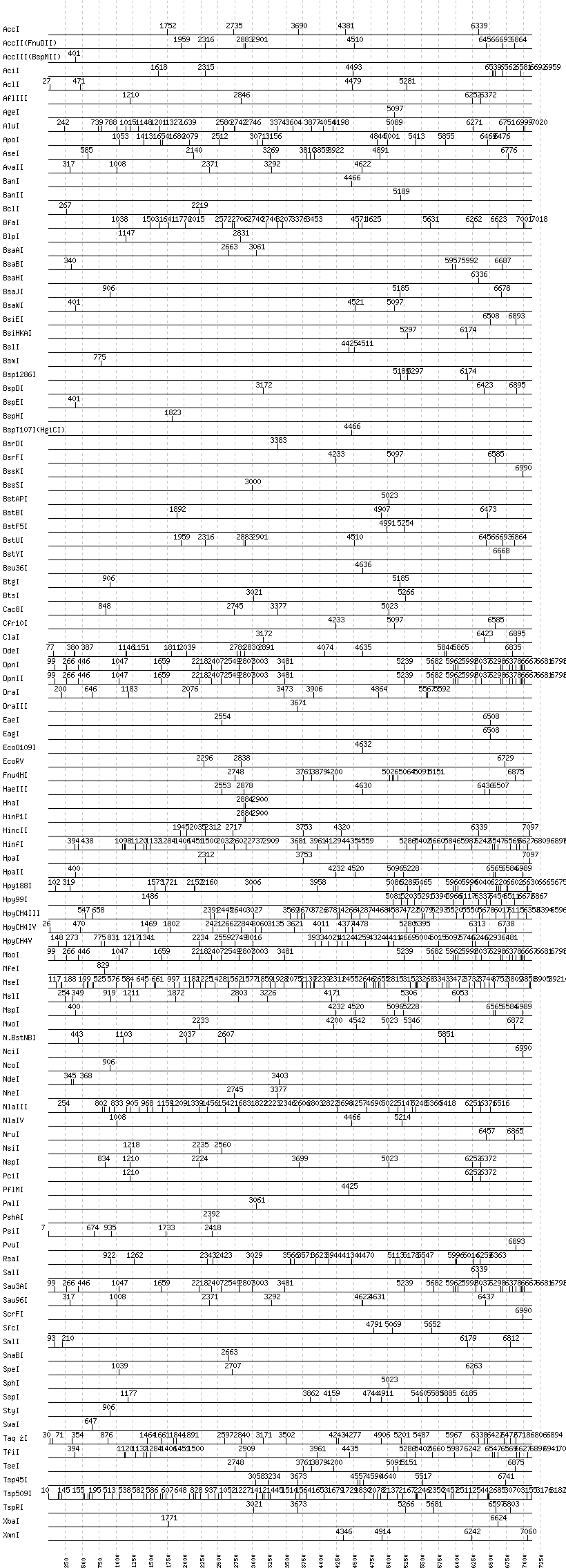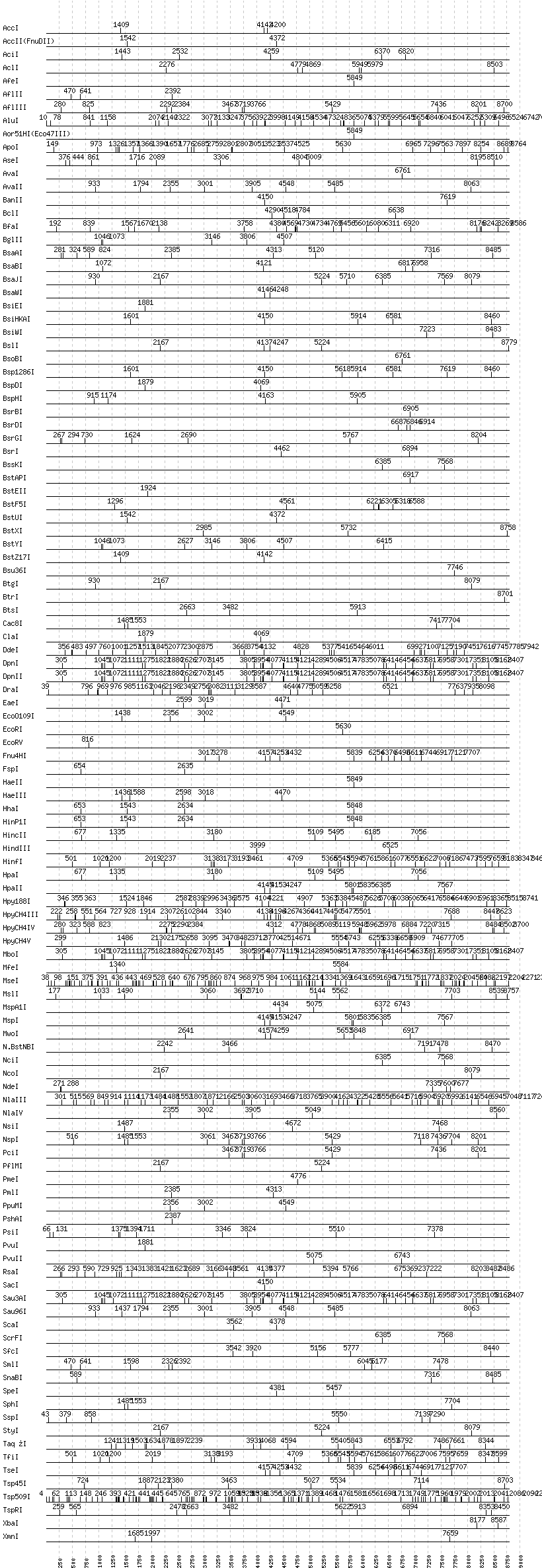 Uncut enzymes: AatII, Acc65I, AfeI, AflII, AhdI, AlwI, AlwNI, Aor51HI(Eco47III), ApaI, ApaLI, AscI, AvaI, AvrII, BaeI, BalI, BamHI, BbsI, BbvCI, BbvI, BcgI, BciVI, BglI, BglII, BmrI, BpmI, BsaI, BsaXI, BseRI, BsgI, BsiWI, BsmAI, BsmBI, BsmFI, BsoBI, BspMI, BsrBI, BsrGI, BsrI, BssHII, BstEII, BstNI, BstXI, BstZ17I, BtrI, DrdI, EarI, EciI, EcoNI, EcoRI, FauI, FokI, FseI, FspI, HaeII, HgaI, HindIII, HphI, I-CeuI, I-SceI, KasI, KpnI, MboII, MluI, MlyI, MnlI, MscI, MspA1I, NaeI, , NarI, NgoMIV, NotI, PI-PspI, PI-SceI(VDE), PacI, PaeR7I, PflFI, PleI, PmeI, PpuMI, PspGI, PspOMI, PstI, PvuII, RsrII, SacI, SacII, SapI, SbfI, ScaI, SexAI, SfaNI, SfiI, SfoI, SgrAI, SmaI, StuI, TliI, Tth111I, XcmI, XhoI, XmaI