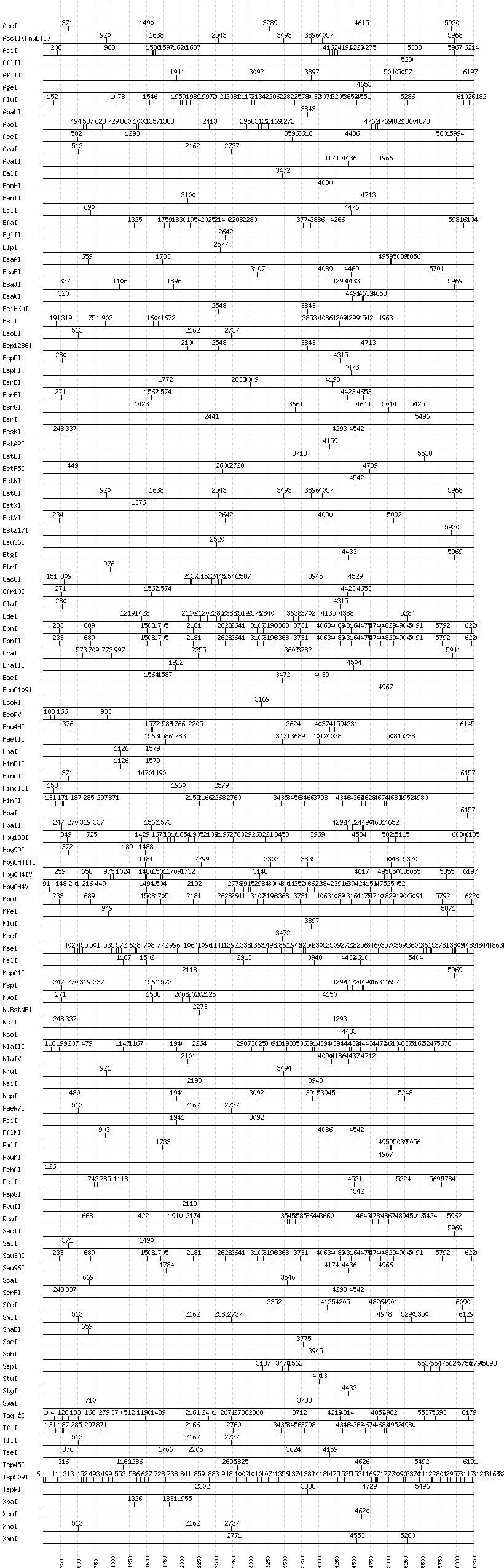 Uncut enzymes: AatII, Acc65I, AccIII(BspMII), AclI, AfeI, AhdI, AlwI, AlwNI, Aor51HI(Eco47III), ApaI, AscI, AvrII, BaeI, BanI, BbsI, BbvCI, BbvI, BcgI, BciVI, BglI, BmrI, BpmI, BsaHI, BsaI, BsaXI, BseRI, BsgI, BsiEI, BsiWI, BsmAI, BsmBI, BsmFI, BsmI, BspEI, BspMI, BspT107I(HgiCI), BsrBI, BssHII, BssSI, BstEII, BtsI, DrdI, EagI, EarI, EciI, EcoNI, FauI, FokI, FseI, FspI, HaeII, HgaI, HphI, I-CeuI, I-SceI, KasI, KpnI, MboII, MlyI, MnlI, NaeI, , NarI, NdeI, NgoMIV, NheI, NotI, PI-PspI, PI-SceI(VDE), PacI, PflFI, PleI, PmeI, PspOMI, PstI, PvuI, RsrII, SacI, SapI, SbfI, SexAI, SfaNI, SfiI, SfoI, SgrAI, SmaI, Tth111I, XmaI