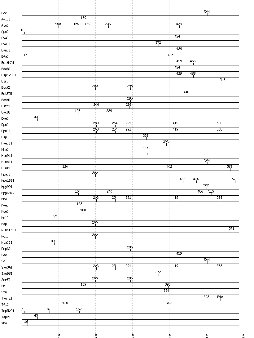Uncut enzymes: AatII, Acc65I, AccII(FnuDII), AccIII(BspMII), AciI, AclI, AfeI, AflIII, AgeI, AhdI, AlwI, AlwNI, Aor51HI(Eco47III), ApaI, ApaLI, AscI, AseI, AvrII, BaeI, BalI, BamHI, BanI, BbsI, BbvCI, BbvI, BcgI, BciVI, BclI, BglI, BglII, BlpI, BmrI, BpmI, BsaAI, BsaBI, BsaHI, BsaI, BsaJI, BsaWI, BsaXI, BseRI, BsgI, BsiEI, BsiWI, BslI, BsmAI, BsmBI, BsmFI, BsmI, BspDI, BspEI, BspHI, BspMI, BspT107I(HgiCI), BsrBI, BsrDI, BsrFI, BsrGI, BssHII, BssSI, BstAPI, BstBI, BstEII, BstUI, BstXI, BstZ17I, Bsu36I, BtgI, BtrI, BtsI, Cfr10I, ClaI, DraI, DraIII, DrdI, EaeI, EagI, EarI, EciI, EcoNI, EcoO109I, EcoRI, EcoRV, FauI, Fnu4HI, FokI, FseI, HaeII, HgaI, HindIII, HpaI, HphI, HpyCH4III, HpyCH4IV, I-CeuI, I-SceI, KasI, KpnI, MboII, MluI, MlyI, MnlI, MscI, MspA1I, MwoI, NaeI, , NarI, NcoI, NdeI, NgoMIV, NheI, NlaIV, NotI, NruI, NsiI, NspI, PI-PspI, PI-SceI(VDE), PacI, PaeR7I, PciI, PflFI, PflMI, PleI, PmeI, PmlI, PpuMI, PshAI, PsiI, PspOMI, PstI, PvuI, PvuII, RsaI, RsrII, SacII, SapI, SbfI, ScaI, SexAI, SfaNI, SfcI, SfiI, SfoI, SgrAI, SmaI, SnaBI, SpeI, SphI, SspI, StyI, SwaI, TliI, TseI, Tsp45I, Tth111I, XcmI, XhoI, XmaI, XmnI