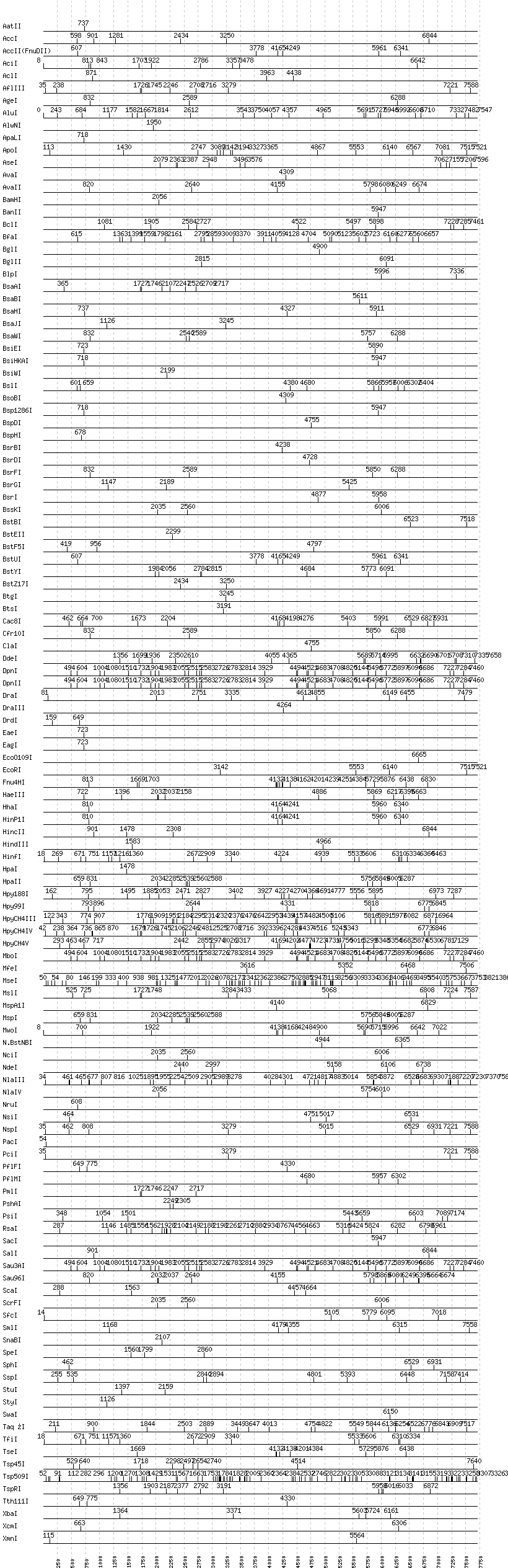 Uncut enzymes: Acc65I, AccIII(BspMII), AfeI, AflII, AhdI, AlwI, Aor51HI(Eco47III), ApaI, AscI, AvrII, BaeI, BalI, BanI, BbsI, BbvCI, BbvI, BcgI, BciVI, BmrI, BpmI, BsaI, BsaXI, BseRI, BsgI, BsmAI, BsmBI, BsmFI, BsmI, BspEI, BspMI, BspT107I(HgiCI), BssHII, BssSI, BstAPI, BstNI, BstXI, Bsu36I, BtrI, EarI, EciI, EcoNI, EcoRV, FauI, FokI, FseI, FspI, HaeII, HgaI, HphI, I-CeuI, I-SceI, KasI, KpnI, MboII, MluI, MlyI, MnlI, MscI, NaeI, , NarI, NcoI, NgoMIV, NheI, NotI, PI-PspI, PI-SceI(VDE), PaeR7I, PleI, PmeI, PpuMI, PspGI, PspOMI, PstI, PvuI, PvuII, RsrII, SacII, SapI, SbfI, SexAI, SfaNI, SfiI, SfoI, SgrAI, SmaI, TliI, XhoI, XmaI