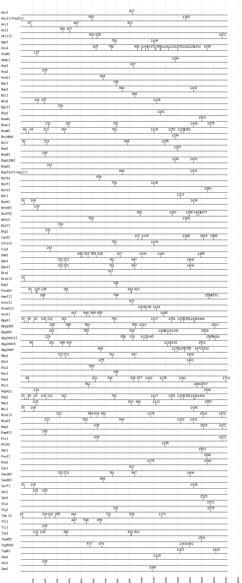 Uncut enzymes: AatII, Acc65I, AccIII(BspMII), AfeI, AflII, AhdI, AlwI, Aor51HI(Eco47III), ApaI, ApoI, AscI, AvrII, BaeI, BamHI, BanII, BbsI, BbvCI, BbvI, BcgI, BciVI, BglI, BmrI, BpmI, BsaBI, BsaHI, BsaI, BsaXI, BseRI, BsgI, BsiEI, BsiWI, BsmAI, BsmBI, BsmFI, BspEI, BspHI, BspMI, BsrBI, BssHII, BssSI, BstBI, BstEII, BstNI, BstXI, BstZ17I, Bsu36I, BtrI, BtsI, DrdI, EagI, EarI, EciI, EcoNI, EcoO109I, EcoRI, EcoRV, FauI, FokI, FseI, FspI, HaeII, HgaI, HhaI, HinP1I, HpaI, HphI, I-CeuI, I-SceI, KasI, KpnI, MboII, MlyI, MnlI, N.BstNBI, NaeI, , NarI, NcoI, NdeI, NgoMIV, NheI, NotI, NruI, NsiI, PI-PspI, PI-SceI(VDE), PacI, PflFI, PleI, PmeI, PpuMI, PshAI, PsiI, PspGI, PspOMI, PstI, PvuI, RsrII, SacI, SacII, SapI, SbfI, ScaI, SexAI, SfaNI, SfcI, SfiI, SfoI, SgrAI, SmaI, SnaBI, SpeI, SspI, SwaI, Tth111I, XcmI, XmaI