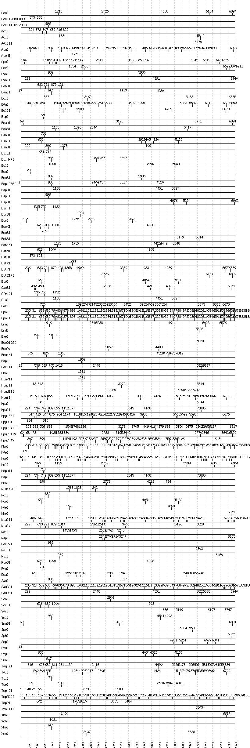 Uncut enzymes: AatII, Acc65I, AfeI, AflII, AgeI, AhdI, AlwI, Aor51HI(Eco47III), ApaI, ApaLI, AscI, AvrII, BaeI, BalI, BanI, BbsI, BbvCI, BbvI, BcgI, BciVI, BglI, BmrI, BpmI, BsaI, BsaXI, BseRI, BsgI, BsiWI, BsmAI, BsmBI, BsmFI, BspMI, BspT107I(HgiCI), BsrBI, BsrDI, BssHII, BstAPI, BstEII, Bsu36I, BtrI, BtsI, DraIII, EagI, EarI, EciI, EcoNI, EcoRI, FauI, FokI, FseI, HaeII, HgaI, HphI, I-CeuI, I-SceI, KasI, KpnI, MboII, MluI, MlyI, MnlI, MscI, NaeI, , NarI, NgoMIV, NotI, NruI, PI-PspI, PI-SceI(VDE), PacI, PciI, PflMI, PleI, PmeI, PmlI, PpuMI, PshAI, PspOMI, PstI, PvuII, RsrII, SacII, SalI, SapI, SbfI, SexAI, SfaNI, SfiI, SfoI, SgrAI, SmaI, XmaI