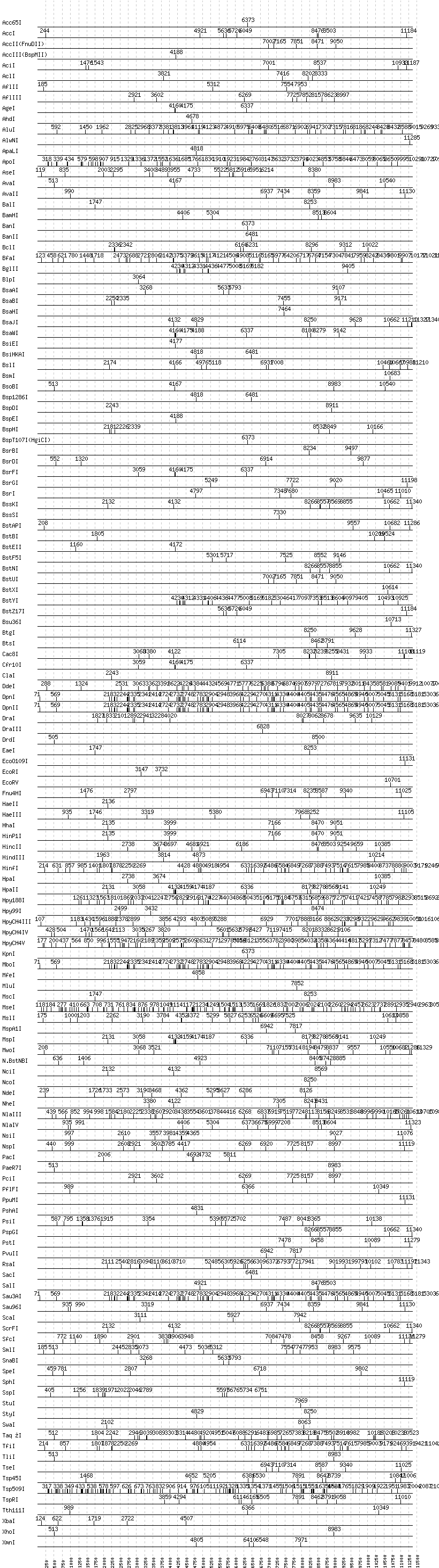 Uncut enzymes: AatII, AfeI, AlwI, Aor51HI(Eco47III), ApaI, AscI, AvrII, BaeI, BbsI, BbvCI, BbvI, BcgI, BciVI, BglI, BmrI, BpmI, BsaI, BsaXI, BseRI, BsgI, BsiWI, BsmAI, BsmBI, BsmFI, BspMI, BssHII, BtrI, EagI, EarI, EciI, EcoNI, FauI, FokI, FseI, FspI, HgaI, HphI, I-CeuI, I-SceI, KasI, MboII, MlyI, MnlI, NaeI, , NarI, NgoMIV, NotI, NruI, PI-PspI, PI-SceI(VDE), PflMI, PleI, PmeI, PmlI, PspOMI, PvuI, RsrII, SacII, SapI, SbfI, SexAI, SfaNI, SfiI, SfoI, SgrAI, SmaI, XcmI, XmaI