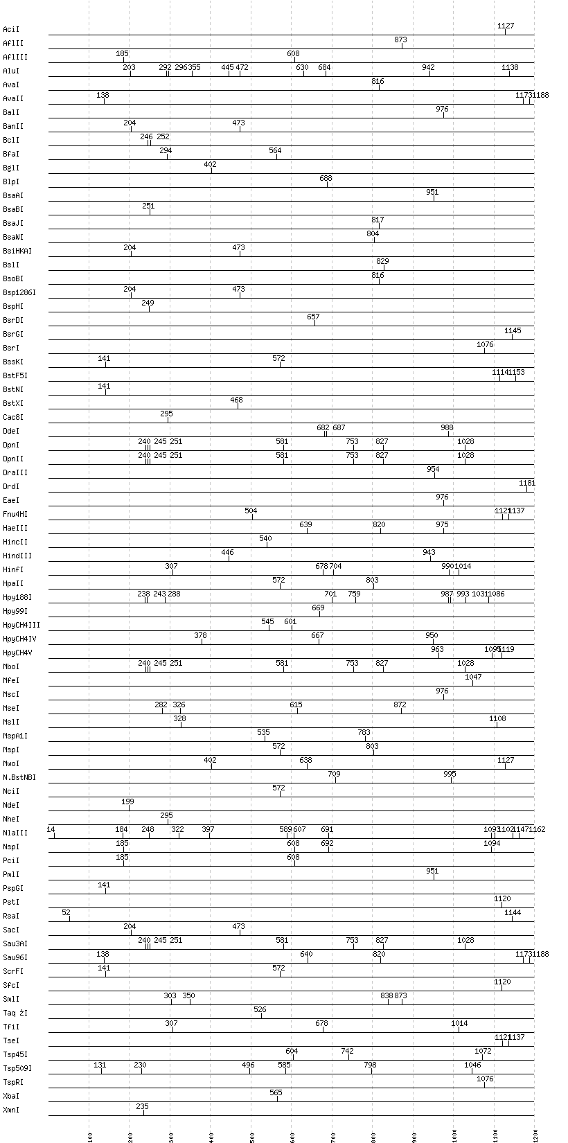 Uncut enzymes: AatII, Acc65I, AccI, AccII(FnuDII), AccIII(BspMII), AclI, AfeI, AgeI, AhdI, AlwI, AlwNI, Aor51HI(Eco47III), ApaI, ApaLI, ApoI, AscI, AseI, AvrII, BaeI, BamHI, BanI, BbsI, BbvCI, BbvI, BcgI, BciVI, BglII, BmrI, BpmI, BsaHI, BsaI, BsaXI, BseRI, BsgI, BsiEI, BsiWI, BsmAI, BsmBI, BsmFI, BsmI, BspDI, BspEI, BspMI, BspT107I(HgiCI), BsrBI, BsrFI, BssHII, BssSI, BstAPI, BstBI, BstEII, BstUI, BstYI, BstZ17I, Bsu36I, BtgI, BtrI, BtsI, Cfr10I, ClaI, DraI, EagI, EarI, EciI, EcoNI, EcoO109I, EcoRI, EcoRV, FauI, FokI, FseI, FspI, HaeII, HgaI, HhaI, HinP1I, HpaI, HphI, I-CeuI, I-SceI, KasI, KpnI, MboII, MluI, MlyI, MnlI, NaeI, , NarI, NcoI, NgoMIV, NlaIV, NotI, NruI, NsiI, PI-PspI, PI-SceI(VDE), PacI, PaeR7I, PflFI, PflMI, PleI, PmeI, PpuMI, PshAI, PsiI, PspOMI, PvuI, PvuII, RsrII, SacII, SalI, SapI, SbfI, ScaI, SexAI, SfaNI, SfiI, SfoI, SgrAI, SmaI, SnaBI, SpeI, SphI, SspI, StuI, StyI, SwaI, TliI, Tth111I, XcmI, XhoI, XmaI