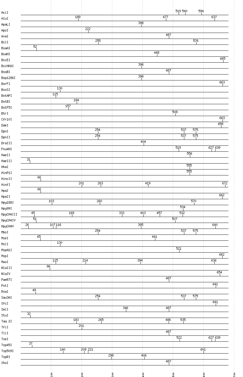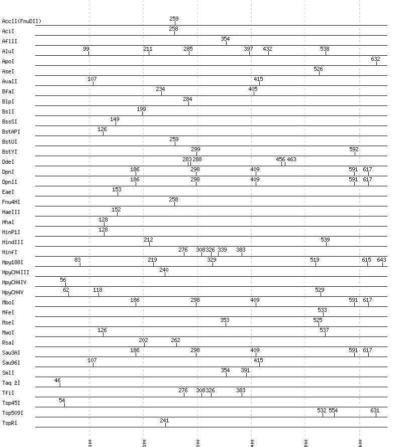 Uncut enzymes: AatII, Acc65I, AccI, AccIII(BspMII), AclI, AfeI, AflIII, AgeI, AhdI, AlwI, AlwNI, Aor51HI(Eco47III), ApaI, ApaLI, AscI, AvaI, AvrII, BaeI, BalI, BamHI, BanI, BanII, BbsI, BbvCI, BbvI, BcgI, BciVI, BclI, BglI, BglII, BmrI, BpmI, BsaAI, BsaBI, BsaHI, BsaI, BsaJI, BsaWI, BsaXI, BseRI, BsgI, BsiEI, BsiHKAI, BsiWI, BsmAI, BsmBI, BsmFI, BsmI, BsoBI, Bsp1286I, BspDI, BspEI, BspHI, BspMI, BspT107I(HgiCI), BsrBI, BsrDI, BsrFI, BsrGI, BsrI, BssHII, BssKI, BstBI, BstEII, BstF5I, BstNI, BstXI, BstZ17I, Bsu36I, BtgI, BtrI, BtsI, Cac8I, Cfr10I, ClaI, DraI, DraIII, DrdI, EagI, EarI, EciI, EcoNI, EcoO109I, EcoRI, EcoRV, FauI, FokI, FseI, FspI, HaeII, HgaI, HincII, HpaI, HpaII, HphI, Hpy99I, I-CeuI, I-SceI, KasI, KpnI, MboII, MluI, MlyI, MnlI, MscI, MslI, MspA1I, MspI, N.BstNBI, NaeI, , NarI, NciI, NcoI, NdeI, NgoMIV, NheI, NlaIII, NlaIV, NotI, NruI, NsiI, NspI, PI-PspI, PI-SceI(VDE), PacI, PaeR7I, PciI, PflFI, PflMI, PleI, PmeI, PmlI, PpuMI, PshAI, PsiI, PspGI, PspOMI, PstI, PvuI, PvuII, RsrII, SacI, SacII, SalI, SapI, SbfI, ScaI, ScrFI, SexAI, SfaNI, SfcI, SfiI, SfoI, SgrAI, SmaI, SnaBI, SpeI, SphI, SspI, StuI, StyI, SwaI, TliI, TseI, Tth111I, XbaI, XcmI, XhoI, XmaI, XmnI