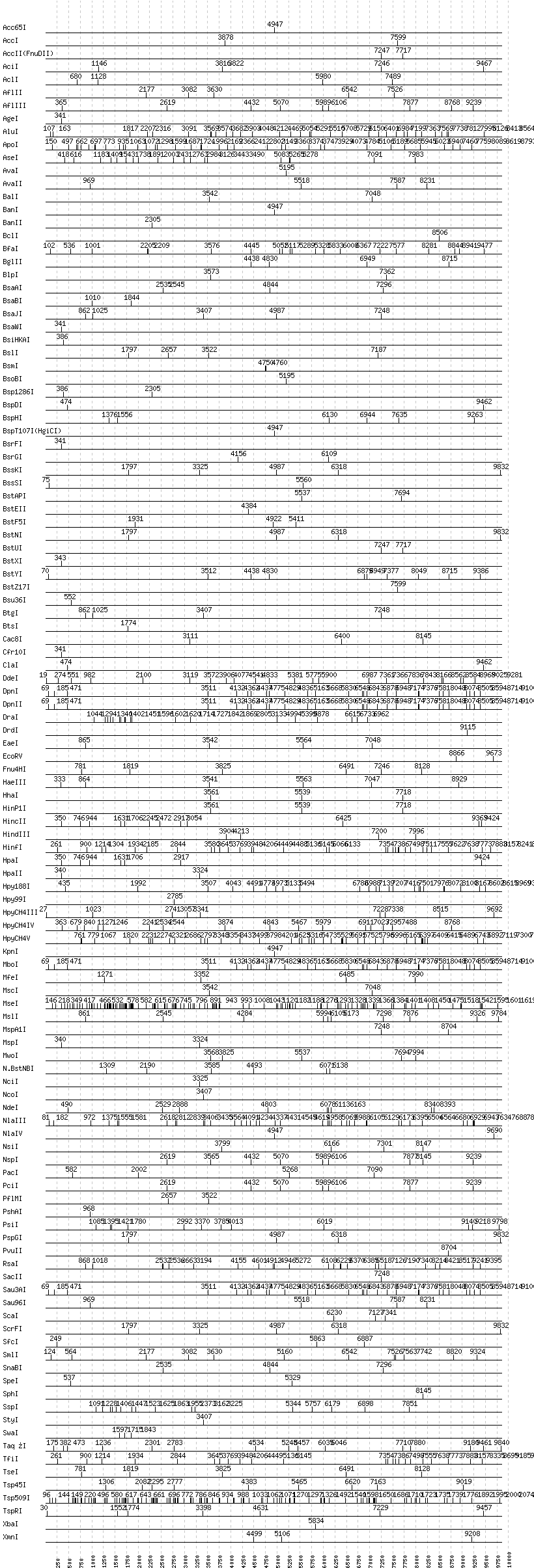 Uncut enzymes: AatII, AccIII(BspMII), AfeI, AhdI, AlwI, AlwNI, Aor51HI(Eco47III), ApaI, ApaLI, AscI, AvrII, BaeI, BamHI, BbsI, BbvCI, BbvI, BcgI, BciVI, BglI, BmrI, BpmI, BsaHI, BsaI, BsaXI, BseRI, BsgI, BsiEI, BsiWI, BsmAI, BsmBI, BsmFI, BspEI, BspMI, BsrBI, BsrDI, BsrI, BssHII, BstBI, BtrI, DraIII, EagI, EarI, EciI, EcoNI, EcoO109I, EcoRI, FauI, FokI, FseI, FspI, HaeII, HgaI, HphI, I-CeuI, I-SceI, KasI, MboII, MluI, MlyI, MnlI, NaeI, , NarI, NgoMIV, NheI, NotI, NruI, PI-PspI, PI-SceI(VDE), PaeR7I, PflFI, PleI, PmeI, PmlI, PpuMI, PspOMI, PstI, PvuI, RsrII, SacI, SalI, SapI, SbfI, SexAI, SfaNI, SfiI, SfoI, SgrAI, SmaI, StuI, TliI, Tth111I, XcmI, XhoI, XmaI