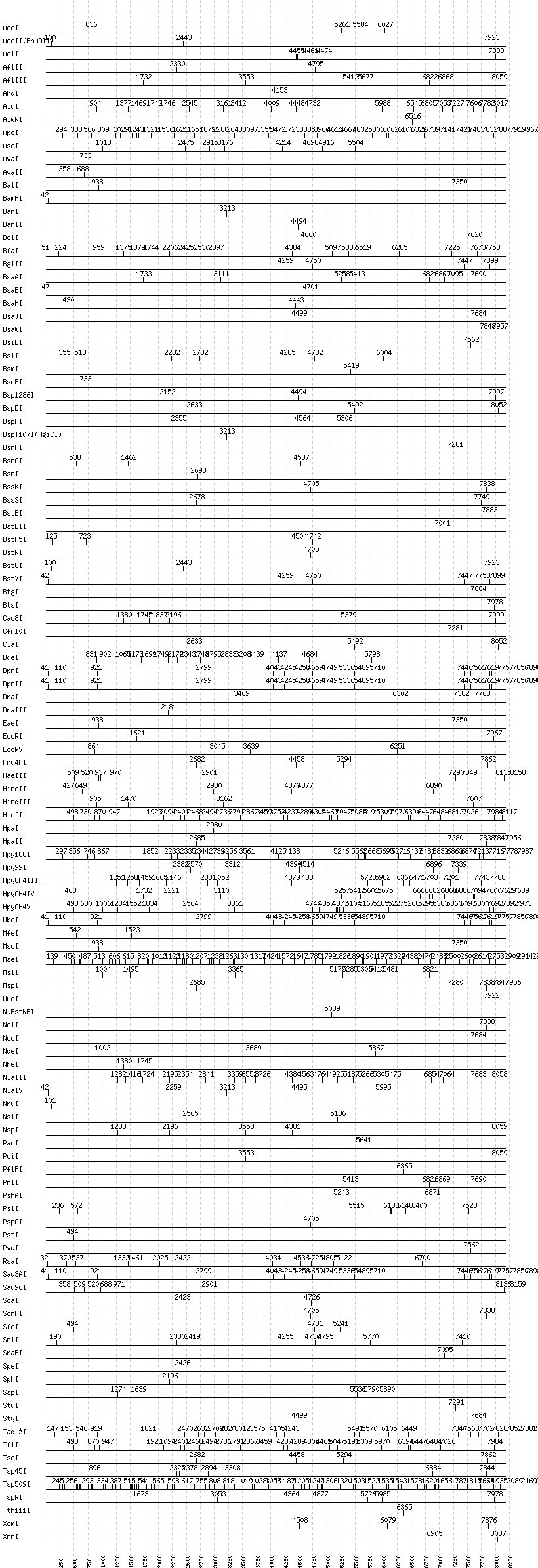 Uncut enzymes: AatII, Acc65I, AccIII(BspMII), AclI, AfeI, AgeI, AlwI, Aor51HI(Eco47III), ApaI, ApaLI, AscI, AvrII, BaeI, BbsI, BbvCI, BbvI, BcgI, BciVI, BglI, BlpI, BmrI, BpmI, BsaI, BsaXI, BseRI, BsgI, BsiHKAI, BsiWI, BsmAI, BsmBI, BsmFI, BspEI, BspMI, BsrBI, BsrDI, BssHII, BstAPI, BstXI, BstZ17I, Bsu36I, BtrI, DrdI, EagI, EarI, EciI, EcoNI, EcoO109I, FauI, FokI, FseI, FspI, HaeII, HgaI, HhaI, HinP1I, HphI, I-CeuI, I-SceI, KasI, KpnI, MboII, MluI, MlyI, MnlI, MspA1I, NaeI, , NarI, NgoMIV, NotI, PI-PspI, PI-SceI(VDE), PaeR7I, PflMI, PleI, PmeI, PpuMI, PspOMI, PvuII, RsrII, SacI, SacII, SalI, SapI, SbfI, SexAI, SfaNI, SfiI, SfoI, SgrAI, SmaI, SwaI, TliI, XbaI, XhoI, XmaI