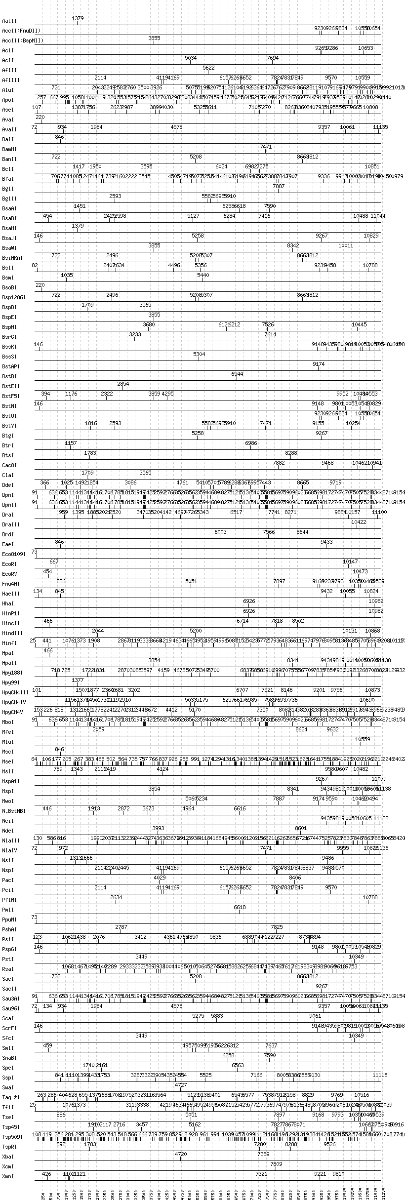 Uncut enzymes: Acc65I, AccI, AfeI, AgeI, AhdI, AlwI, AlwNI, Aor51HI(Eco47III), ApaI, ApaLI, AscI, AvrII, BaeI, BanI, BbsI, BbvCI, BbvI, BcgI, BciVI, BlpI, BmrI, BpmI, BsaI, BsaXI, BseRI, BsgI, BsiEI, BsiWI, BsmAI, BsmBI, BsmFI, BspMI, BspT107I(HgiCI), BsrBI, BsrDI, BsrFI, BsrI, BssHII, BstXI, BstZ17I, Bsu36I, Cfr10I, EagI, EarI, EciI, EcoNI, FauI, FokI, FseI, FspI, HaeII, HgaI, HphI, I-CeuI, I-SceI, KasI, KpnI, MboII, MlyI, MnlI, NaeI, , NarI, NcoI, NgoMIV, NheI, NotI, NruI, PI-PspI, PI-SceI(VDE), PaeR7I, PflFI, PleI, PmeI, PspOMI, PvuI, PvuII, RsrII, SalI, SapI, SbfI, SexAI, SfaNI, SfiI, SfoI, SgrAI, SmaI, SphI, StuI, StyI, TliI, Tth111I, XhoI, XmaI