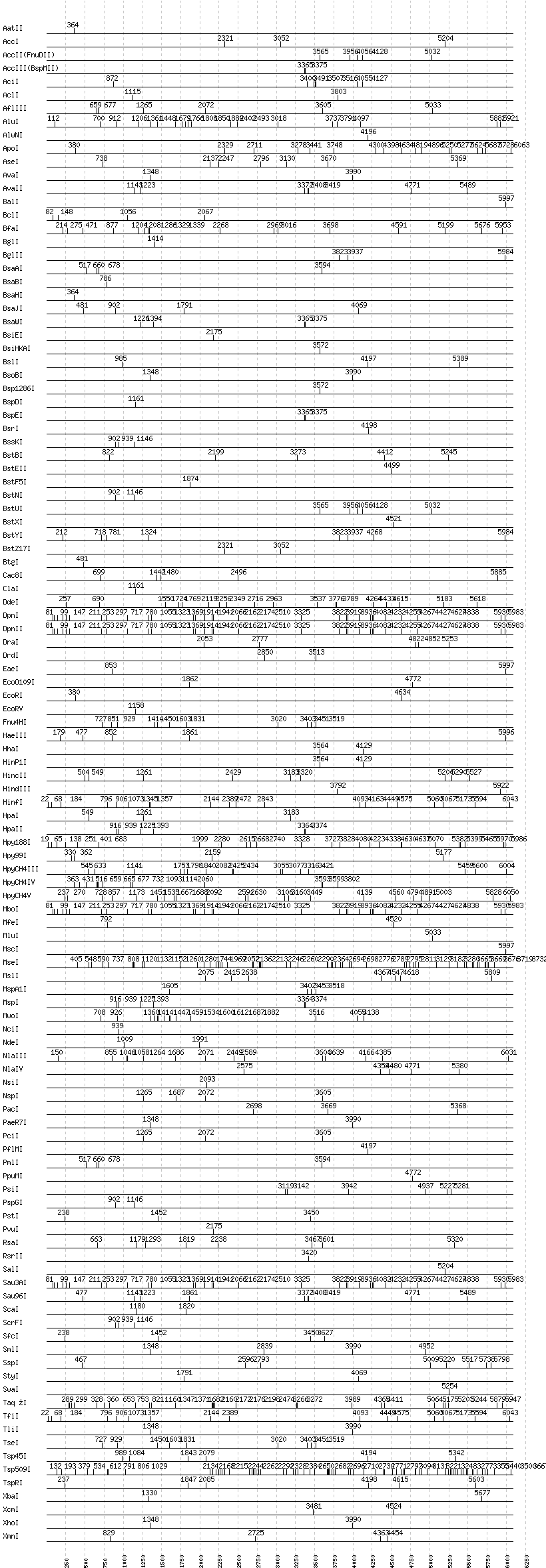 Uncut enzymes: Acc65I, AfeI, AflII, AgeI, AhdI, AlwI, Aor51HI(Eco47III), ApaI, ApaLI, AscI, AvrII, BaeI, BamHI, BanI, BanII, BbsI, BbvCI, BbvI, BcgI, BciVI, BlpI, BmrI, BpmI, BsaI, BsaXI, BseRI, BsgI, BsiWI, BsmAI, BsmBI, BsmFI, BsmI, BspHI, BspMI, BspT107I(HgiCI), BsrBI, BsrDI, BsrFI, BsrGI, BssHII, BssSI, BstAPI, Bsu36I, BtrI, BtsI, Cfr10I, DraIII, EagI, EarI, EciI, EcoNI, FauI, FokI, FseI, FspI, HaeII, HgaI, HphI, I-CeuI, I-SceI, KasI, KpnI, MboII, MlyI, MnlI, N.BstNBI, NaeI, , NarI, NcoI, NgoMIV, NheI, NotI, NruI, PI-PspI, PI-SceI(VDE), PflFI, PleI, PmeI, PshAI, PspOMI, PvuII, SacI, SacII, SapI, SbfI, SexAI, SfaNI, SfiI, SfoI, SgrAI, SmaI, SnaBI, SpeI, SphI, StuI, Tth111I, XmaI