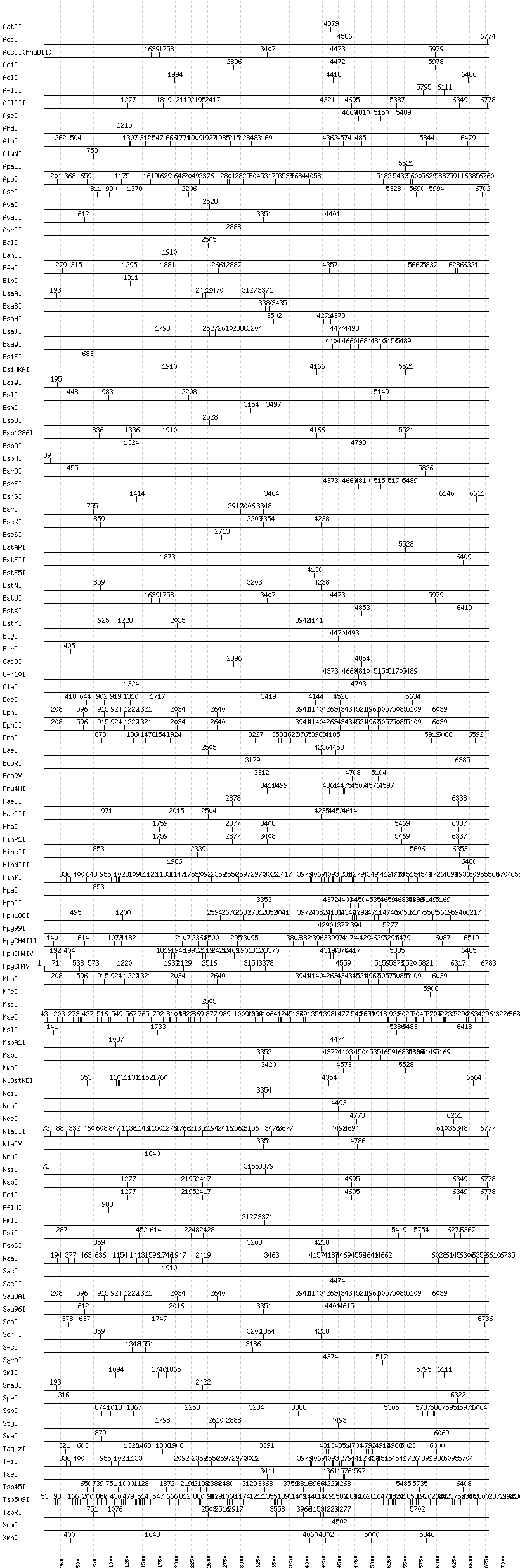 Uncut enzymes: Acc65I, AccIII(BspMII), AfeI, AlwI, Aor51HI(Eco47III), ApaI, AscI, BaeI, BamHI, BanI, BbsI, BbvCI, BbvI, BcgI, BciVI, BclI, BglI, BglII, BmrI, BpmI, BsaI, BsaXI, BseRI, BsgI, BsmAI, BsmBI, BsmFI, BspEI, BspMI, BspT107I(HgiCI), BsrBI, BssHII, BstBI, BstZ17I, Bsu36I, BtsI, DraIII, DrdI, EagI, EarI, EciI, EcoNI, EcoO109I, FauI, FokI, FseI, FspI, HgaI, HphI, I-CeuI, I-SceI, KasI, KpnI, MboII, MluI, MlyI, MnlI, NaeI, , NarI, NgoMIV, NheI, NotI, PI-PspI, PI-SceI(VDE), PacI, PaeR7I, PflFI, PleI, PmeI, PpuMI, PshAI, PspOMI, PstI, PvuI, PvuII, RsrII, SalI, SapI, SbfI, SexAI, SfaNI, SfiI, SfoI, SmaI, SphI, StuI, TliI, Tth111I, XbaI, XhoI, XmaI
