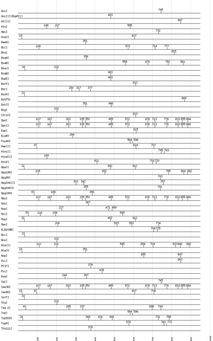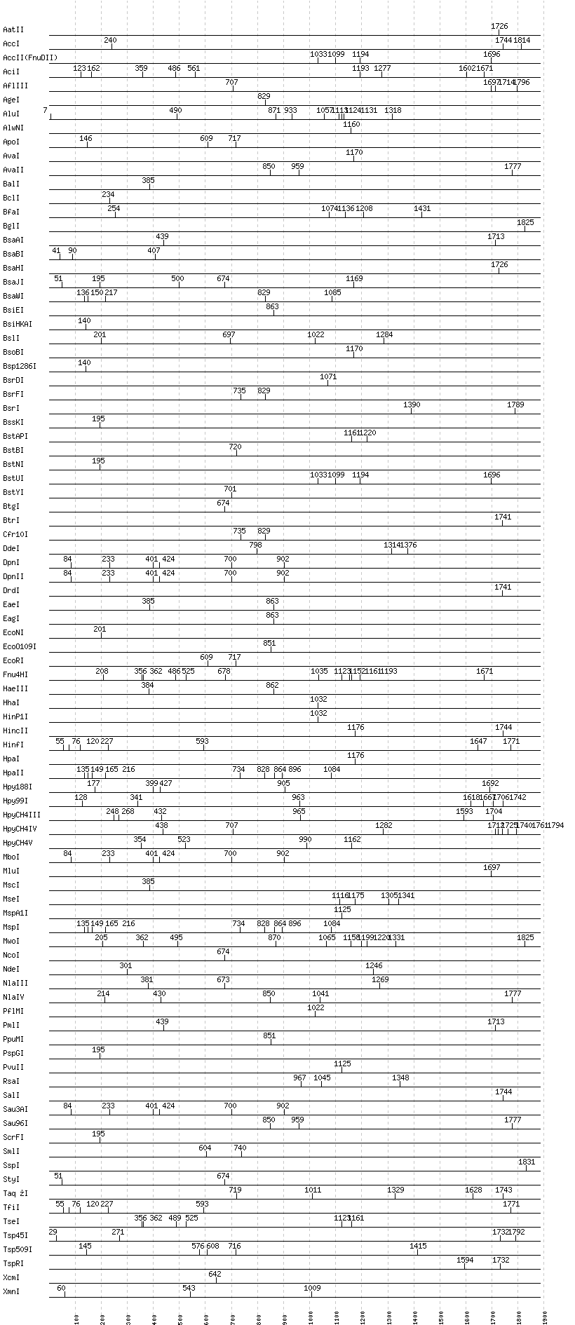Uncut enzymes: AatII, Acc65I, AccII(FnuDII), AciI, AclI, AfeI, AflII, AgeI, AhdI, AlwI, AlwNI, Aor51HI(Eco47III), ApaI, ApaLI, AscI, AseI, AvaI, AvrII, BaeI, BalI, BanI, BanII, BbsI, BbvCI, BbvI, BcgI, BciVI, BglI, BglII, BlpI, BmrI, BpmI, BsaHI, BsaI, BsaXI, BseRI, BsgI, BsiEI, BsiHKAI, BsiWI, BslI, BsmAI, BsmBI, BsmFI, BsmI, BsoBI, Bsp1286I, BspDI, BspHI, BspMI, BspT107I(HgiCI), BsrBI, BsrDI, BsrGI, BssHII, BssSI, BstAPI, BstBI, BstEII, BstNI, BstUI, BstXI, BstZ17I, Bsu36I, BtrI, BtsI, Cac8I, ClaI, DdeI, DraI, DraIII, DrdI, EagI, EarI, EciI, EcoNI, EcoO109I, EcoRI, FauI, FokI, FseI, FspI, HaeII, HgaI, HhaI, HinP1I, HpaI, HphI, I-CeuI, I-SceI, KasI, KpnI, MboII, MluI, MlyI, MnlI, MscI, MspA1I, NaeI, , NarI, NdeI, NgoMIV, NheI, NotI, NruI, NsiI, PI-PspI, PI-SceI(VDE), PacI, PaeR7I, PflMI, PleI, PmeI, PmlI, PpuMI, PshAI, PspGI, PspOMI, PstI, PvuI, PvuII, RsrII, SacI, SacII, SapI, SbfI, ScaI, SexAI, SfaNI, SfcI, SfiI, SfoI, SgrAI, SmaI, SmlI, SnaBI, SpeI, SphI, SspI, StuI, SwaI, TfiI, TliI, Tsp45I, XbaI, XcmI, XhoI, XmaI, XmnI