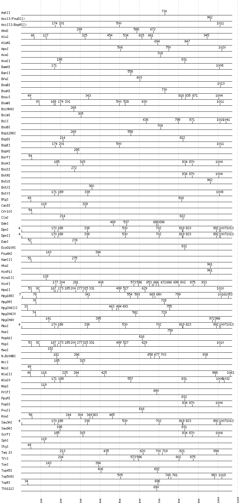 Uncut enzymes: Acc65I, AccI, AciI, AclI, AfeI, AflII, AflIII, AgeI, AlwI, Aor51HI(Eco47III), ApaI, ApaLI, AscI, AseI, AvrII, BaeI, BalI, BanI, BbsI, BbvCI, BbvI, BcgI, BciVI, BclI, BglI, BglII, BlpI, BmrI, BpmI, BsaAI, BsaI, BsaXI, BseRI, BsgI, BsiEI, BsmAI, BsmBI, BsmFI, BsmI, BspMI, BspT107I(HgiCI), BsrBI, BsrDI, BsrGI, BsrI, BssHII, BstAPI, BstBI, BstEII, BstF5I, BstZ17I, Bsu36I, BtrI, BtsI, DraI, DraIII, DrdI, EagI, EarI, EciI, EcoNI, EcoRI, EcoRV, FauI, FokI, FseI, FspI, HaeII, HgaI, HincII, HpaI, HphI, I-CeuI, I-SceI, KasI, KpnI, MboII, MfeI, MluI, MlyI, MnlI, MscI, MslI, NaeI, , NarI, NdeI, NgoMIV, NheI, NotI, NruI, NsiI, PI-PspI, PI-SceI(VDE), PacI, PaeR7I, PciI, PflMI, PleI, PmeI, PmlI, PshAI, PsiI, PspOMI, PstI, PvuI, RsrII, SacI, SacII, SalI, SapI, SbfI, ScaI, SexAI, SfaNI, SfcI, SfiI, SfoI, SgrAI, SmaI, SmlI, SnaBI, SpeI, SspI, StuI, SwaI, TliI, XbaI, XcmI, XhoI, XmaI, XmnI