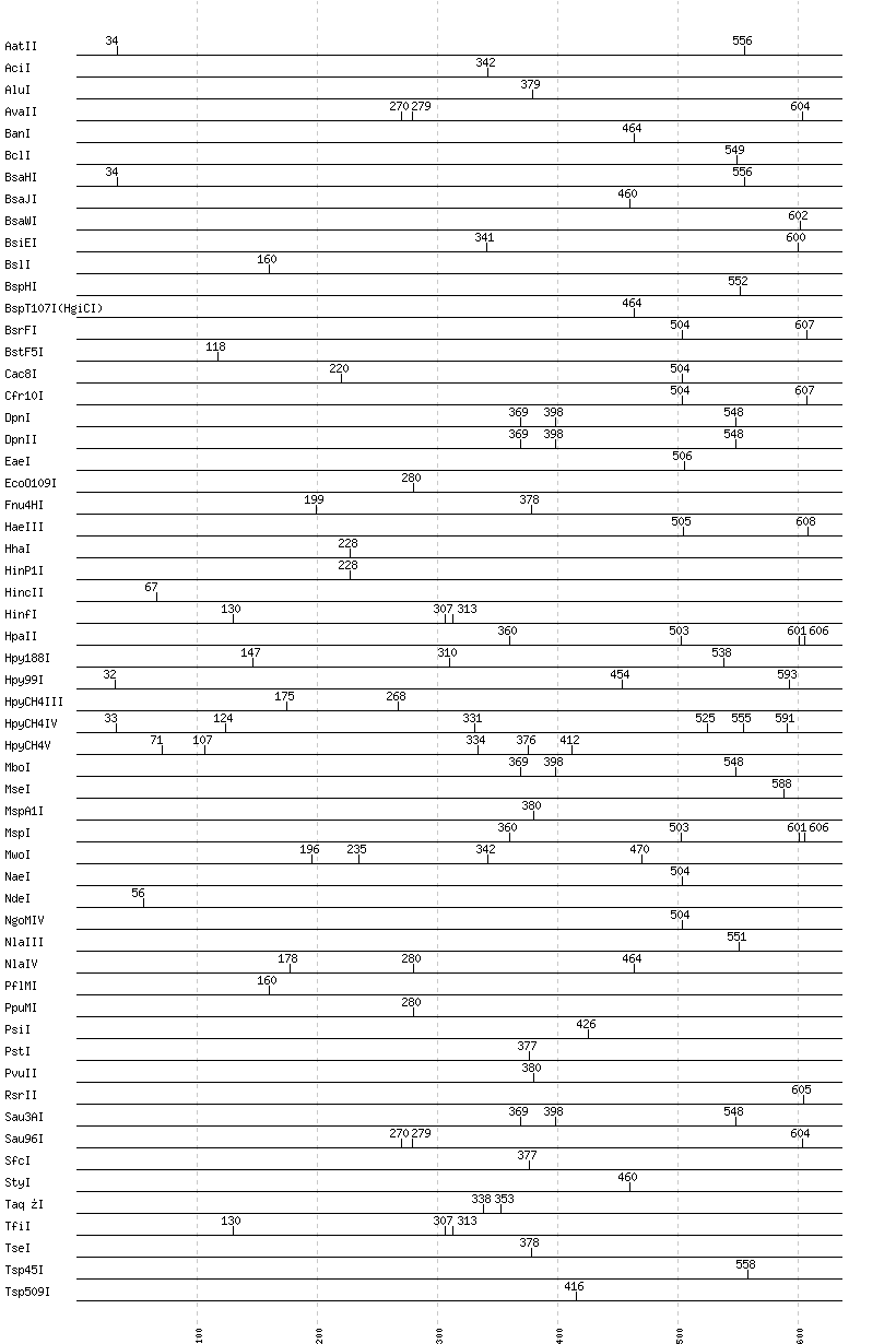 Uncut enzymes: Acc65I, AccI, AccII(FnuDII), AccIII(BspMII), AclI, AfeI, AflII, AflIII, AgeI, AhdI, AlwI, AlwNI, Aor51HI(Eco47III), ApaI, ApaLI, ApoI, AscI, AseI, AvaI, AvrII, BaeI, BalI, BamHI, BanII, BbsI, BbvCI, BbvI, BcgI, BciVI, BfaI, BglI, BglII, BlpI, BmrI, BpmI, BsaAI, BsaBI, BsaI, BsaXI, BseRI, BsgI, BsiHKAI, BsiWI, BsmAI, BsmBI, BsmFI, BsmI, BsoBI, Bsp1286I, BspDI, BspEI, BspMI, BsrBI, BsrDI, BsrGI, BsrI, BssHII, BssKI, BssSI, BstAPI, BstBI, BstEII, BstNI, BstUI, BstXI, BstYI, BstZ17I, Bsu36I, BtgI, BtrI, BtsI, ClaI, DdeI, DraI, DraIII, DrdI, EagI, EarI, EciI, EcoNI, EcoRI, EcoRV, FauI, FokI, FseI, FspI, HaeII, HgaI, HindIII, HpaI, HphI, I-CeuI, I-SceI, KasI, KpnI, MboII, MfeI, MluI, MlyI, MnlI, MscI, MslI, N.BstNBI, , NarI, NciI, NcoI, NheI, NotI, NruI, NsiI, NspI, PI-PspI, PI-SceI(VDE), PacI, PaeR7I, PciI, PflFI, PleI, PmeI, PmlI, PshAI, PspGI, PspOMI, PvuI, RsaI, SacI, SacII, SalI, SapI, SbfI, ScaI, ScrFI, SexAI, SfaNI, SfiI, SfoI, SgrAI, SmaI, SmlI, SnaBI, SpeI, SphI, SspI, StuI, SwaI, TliI, TspRI, Tth111I, XbaI, XcmI, XhoI, XmaI, XmnI