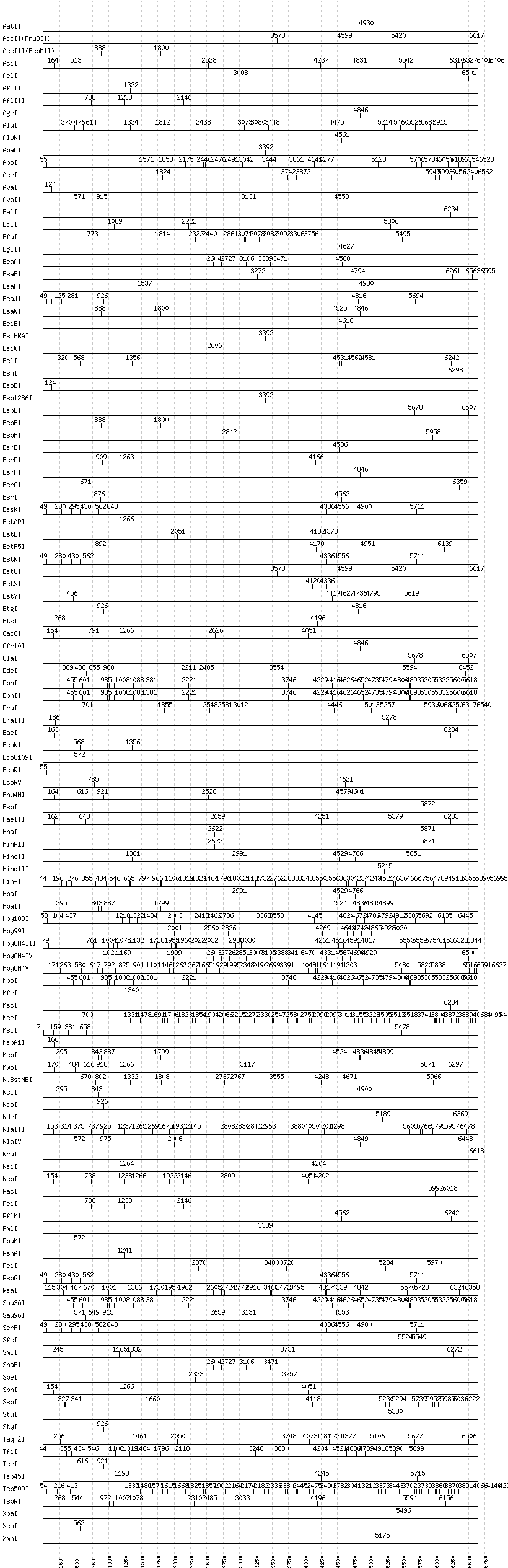 Uncut enzymes: Acc65I, AccI, AfeI, AhdI, AlwI, Aor51HI(Eco47III), ApaI, AscI, AvrII, BaeI, BamHI, BanI, BanII, BbsI, BbvCI, BbvI, BcgI, BciVI, BglI, BlpI, BmrI, BpmI, BsaI, BsaXI, BseRI, BsgI, BsmAI, BsmBI, BsmFI, BspMI, BspT107I(HgiCI), BssHII, BssSI, BstEII, BstZ17I, Bsu36I, BtrI, DrdI, EagI, EarI, EciI, FauI, FokI, FseI, HaeII, HgaI, HphI, I-CeuI, I-SceI, KasI, KpnI, MboII, MluI, MlyI, MnlI, NaeI, , NarI, NgoMIV, NheI, NotI, PI-PspI, PI-SceI(VDE), PaeR7I, PflFI, PleI, PmeI, PspOMI, PstI, PvuI, PvuII, RsrII, SacI, SacII, SalI, SapI, SbfI, ScaI, SexAI, SfaNI, SfiI, SfoI, SgrAI, SmaI, SwaI, TliI, Tth111I, XhoI, XmaI