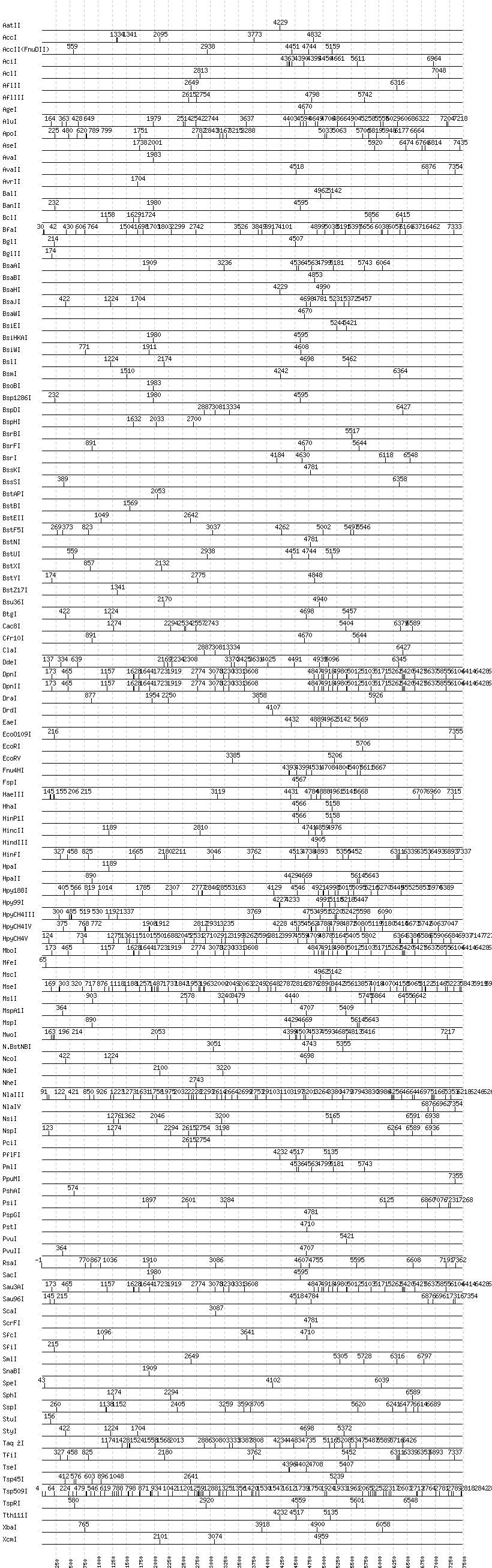 Uncut enzymes: Acc65I, AccIII(BspMII), AfeI, AhdI, AlwI, AlwNI, Aor51HI(Eco47III), ApaI, ApaLI, AscI, BaeI, BamHI, BanI, BbsI, BbvCI, BbvI, BcgI, BciVI, BlpI, BmrI, BpmI, BsaI, BsaXI, BseRI, BsgI, BsmAI, BsmBI, BsmFI, BspEI, BspMI, BspT107I(HgiCI), BsrDI, BsrGI, BssHII, BtrI, BtsI, DraIII, EagI, EarI, EciI, EcoNI, FauI, FokI, FseI, HaeII, HgaI, HphI, I-CeuI, I-SceI, KasI, KpnI, MboII, MluI, MlyI, MnlI, NaeI, , NarI, NciI, NgoMIV, NotI, NruI, PI-PspI, PI-SceI(VDE), PacI, PaeR7I, PflMI, PleI, PmeI, PspOMI, RsrII, SacII, SalI, SapI, SbfI, SexAI, SfaNI, SfoI, SgrAI, SmaI, SwaI, TliI, XhoI, XmaI, XmnI