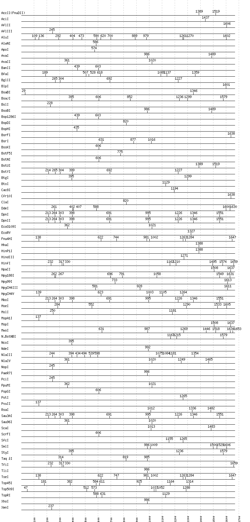Uncut enzymes: AatII, Acc65I, AccI, AccIII(BspMII), AclI, AfeI, AgeI, AhdI, AlwI, Aor51HI(Eco47III), ApaI, ApaLI, AscI, AseI, AvrII, BaeI, BalI, BamHI, BanI, BbsI, BbvCI, BbvI, BcgI, BciVI, BclI, BglI, BmrI, BpmI, BsaAI, BsaHI, BsaI, BsaWI, BsaXI, BseRI, BsgI, BsiEI, BsiHKAI, BsiWI, BsmAI, BsmBI, BsmFI, BsmI, BspEI, BspMI, BspT107I(HgiCI), BsrBI, BsrDI, BsrGI, BssHII, BssSI, BstAPI, BstBI, BstEII, BstXI, BstZ17I, Bsu36I, BtrI, DraI, DraIII, DrdI, EaeI, EagI, EarI, EciI, EcoNI, EcoRI, FauI, FokI, FseI, FspI, HaeII, HaeIII, HgaI, HincII, HpaI, HphI, HpyCH4IV, I-CeuI, I-SceI, KasI, KpnI, MboII, MfeI, MluI, MlyI, MnlI, MscI, NaeI, , NarI, NciI, NgoMIV, NheI, NotI, NruI, NsiI, PI-PspI, PI-SceI(VDE), PacI, PflFI, PflMI, PleI, PmeI, PmlI, PshAI, PsiI, PspOMI, PvuI, RsrII, SacI, SacII, SalI, SapI, SbfI, SexAI, SfaNI, SfiI, SfoI, SgrAI, SmaI, SnaBI, SpeI, SphI, SspI, StuI, SwaI, Tth111I, XbaI, XcmI, XmaI