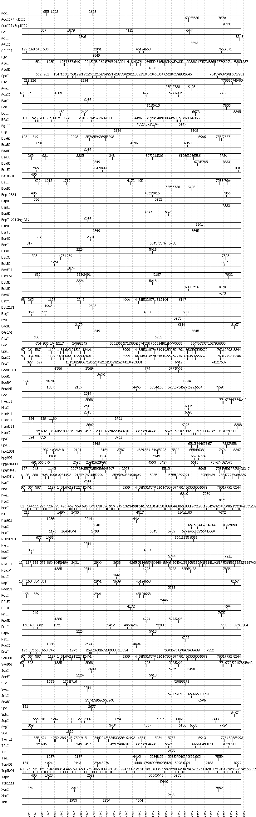Uncut enzymes: AatII, Acc65I, AfeI, AhdI, AlwI, Aor51HI(Eco47III), ApaI, ApaLI, AscI, AvrII, BaeI, BalI, BamHI, BbsI, BbvCI, BbvI, BcgI, BciVI, BglI, BmrI, BpmI, BsaI, BsaXI, BseRI, BsgI, BsiWI, BsmAI, BsmBI, BsmFI, BsmI, BspMI, BsrDI, BssHII, BstAPI, Bsu36I, BtrI, DraIII, DrdI, EaeI, EagI, EarI, EciI, EcoNI, FauI, FokI, FseI, FspI, HgaI, HphI, I-CeuI, I-SceI, KpnI, MboII, MlyI, MnlI, MscI, NaeI, , NciI, NgoMIV, NheI, NotI, NruI, PI-PspI, PI-SceI(VDE), PacI, PleI, PmeI, PshAI, PspOMI, PvuI, RsrII, SacI, SacII, SalI, SapI, SbfI, SexAI, SfaNI, SfiI, SgrAI, SmaI, StuI, XbaI, XmaI