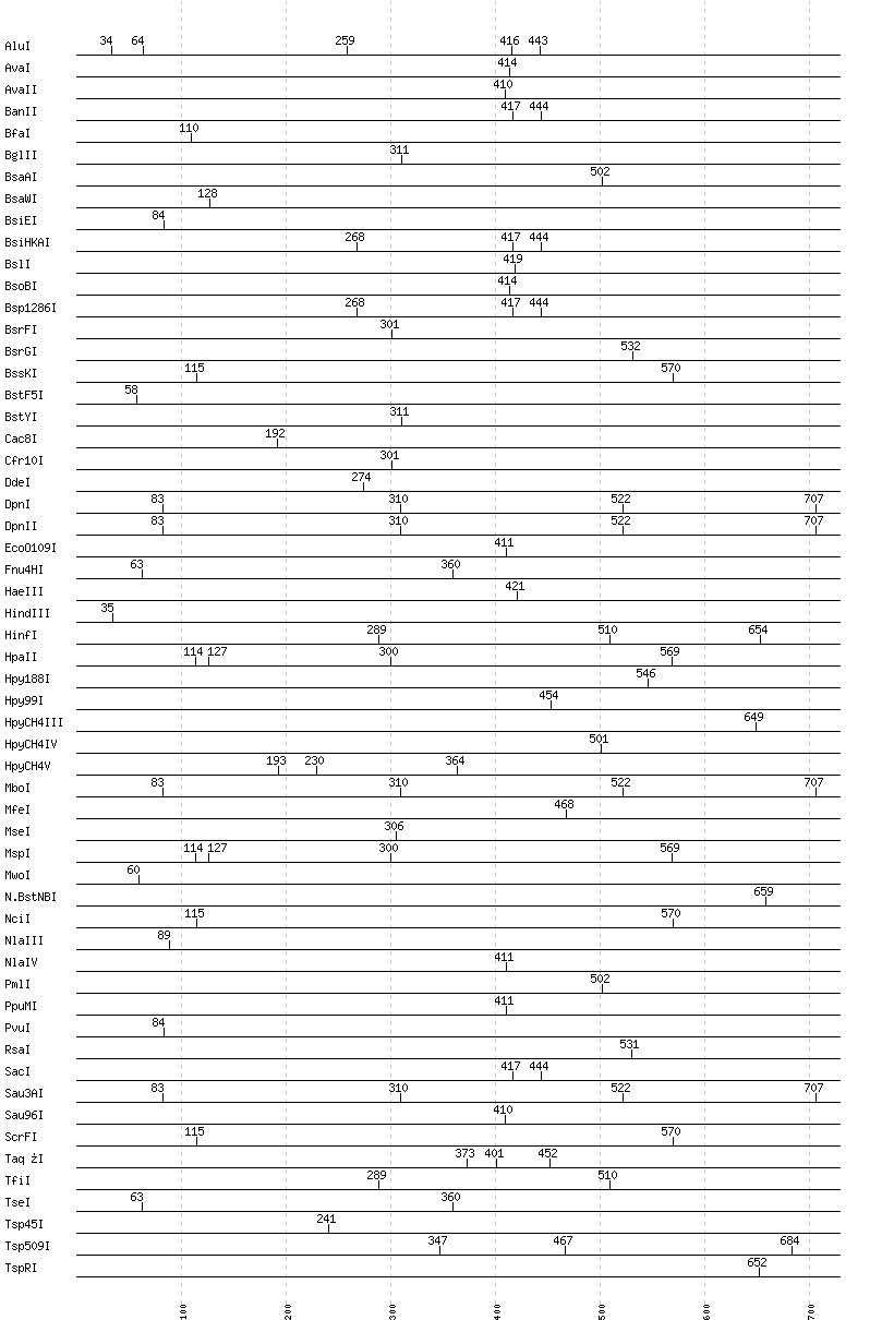 Uncut enzymes: AatII, Acc65I, AccI, AccII(FnuDII), AccIII(BspMII), AciI, AclI, AfeI, AflII, AflIII, AgeI, AhdI, AlwI, AlwNI, Aor51HI(Eco47III), ApaI, ApaLI, ApoI, AscI, AseI, AvrII, BaeI, BalI, BamHI, BanI, BbsI, BbvCI, BbvI, BcgI, BciVI, BclI, BglI, BlpI, BmrI, BpmI, BsaBI, BsaHI, BsaI, BsaJI, BsaXI, BseRI, BsgI, BsiWI, BsmAI, BsmBI, BsmFI, BsmI, BspDI, BspEI, BspHI, BspMI, BspT107I(HgiCI), BsrBI, BsrDI, BsrI, BssHII, BssSI, BstAPI, BstBI, BstEII, BstNI, BstUI, BstXI, BstZ17I, Bsu36I, BtgI, BtrI, BtsI, ClaI, DraI, DraIII, DrdI, EaeI, EagI, EarI, EciI, EcoNI, EcoRI, EcoRV, FauI, FokI, FseI, FspI, HaeII, HgaI, HhaI, HinP1I, HincII, HpaI, HphI, I-CeuI, I-SceI, KasI, KpnI, MboII, MluI, MlyI, MnlI, MscI, MslI, MspA1I, NaeI, , NarI, NcoI, NdeI, NgoMIV, NheI, NotI, NruI, NsiI, NspI, PI-PspI, PI-SceI(VDE), PacI, PaeR7I, PciI, PflFI, PflMI, PleI, PmeI, PshAI, PsiI, PspGI, PspOMI, PstI, PvuII, RsrII, SacII, SalI, SapI, SbfI, ScaI, SexAI, SfaNI, SfcI, SfiI, SfoI, SgrAI, SmaI, SmlI, SnaBI, SpeI, SphI, SspI, StuI, StyI, SwaI, TliI, Tth111I, XbaI, XcmI, XhoI, XmaI, XmnI