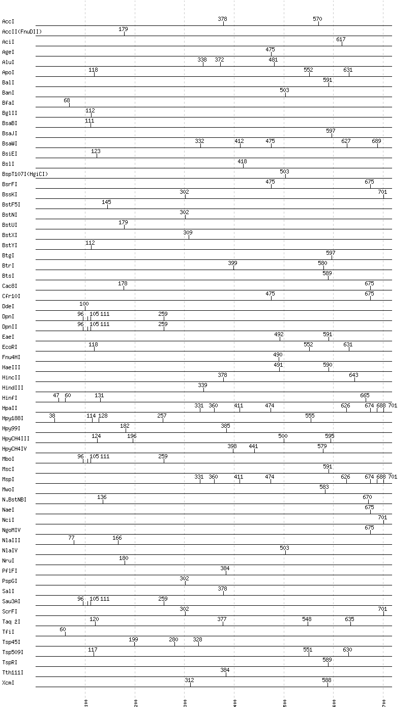 Uncut enzymes: AatII, Acc65I, AccIII(BspMII), AclI, AfeI, AflII, AflIII, AhdI, AlwI, AlwNI, Aor51HI(Eco47III), ApaI, ApaLI, AscI, AseI, AvaI, AvaII, AvrII, BaeI, BamHI, BanII, BbsI, BbvCI, BbvI, BcgI, BciVI, BclI, BglI, BlpI, BmrI, BpmI, BsaAI, BsaHI, BsaI, BsaXI, BseRI, BsgI, BsiHKAI, BsiWI, BsmAI, BsmBI, BsmFI, BsmI, BsoBI, Bsp1286I, BspDI, BspEI, BspHI, BspMI, BsrBI, BsrDI, BsrGI, BsrI, BssHII, BssSI, BstAPI, BstBI, BstEII, BstZ17I, Bsu36I, ClaI, DraI, DraIII, DrdI, EagI, EarI, EciI, EcoNI, EcoO109I, EcoRV, FauI, FokI, FseI, FspI, HaeII, HgaI, HhaI, HinP1I, HpaI, HphI, HpyCH4V, I-CeuI, I-SceI, KasI, KpnI, MboII, MfeI, MluI, MlyI, MnlI, MseI, MslI, MspA1I, , NarI, NcoI, NdeI, NheI, NotI, NsiI, NspI, PI-PspI, PI-SceI(VDE), PacI, PaeR7I, PciI, PflMI, PleI, PmeI, PmlI, PpuMI, PshAI, PsiI, PspOMI, PstI, PvuI, PvuII, RsaI, RsrII, SacI, SacII, SapI, Sau96I, SbfI, ScaI, SexAI, SfaNI, SfcI, SfiI, SfoI, SgrAI, SmaI, SmlI, SnaBI, SpeI, SphI, SspI, StuI, StyI, SwaI, TliI, TseI, XbaI, XhoI, XmaI, XmnI