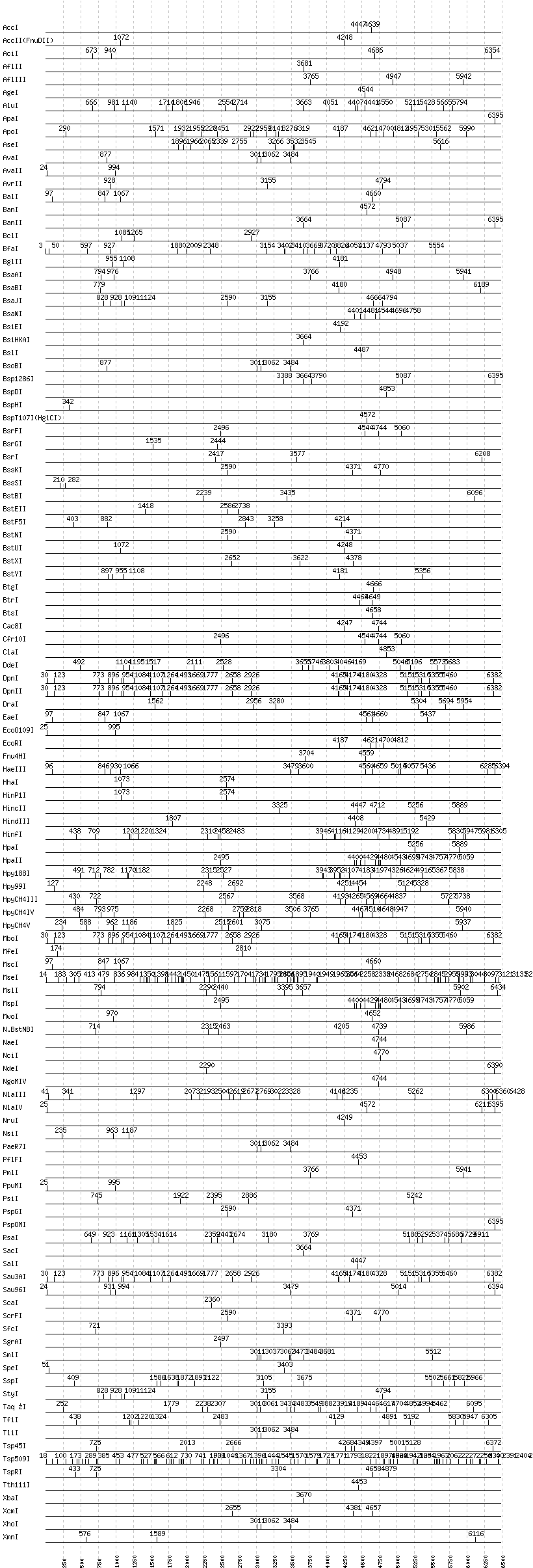 Uncut enzymes: AatII, Acc65I, AccIII(BspMII), AclI, AfeI, AhdI, AlwI, AlwNI, Aor51HI(Eco47III), ApaLI, AscI, BaeI, BamHI, BbsI, BbvCI, BbvI, BcgI, BciVI, BglI, BlpI, BmrI, BpmI, BsaHI, BsaI, BsaXI, BseRI, BsgI, BsiWI, BsmAI, BsmBI, BsmFI, BsmI, BspEI, BspMI, BsrBI, BsrDI, BssHII, BstAPI, BstZ17I, Bsu36I, DraIII, DrdI, EagI, EarI, EciI, EcoNI, EcoRV, FauI, FokI, FseI, FspI, HaeII, HgaI, HphI, I-CeuI, I-SceI, KasI, KpnI, MboII, MluI, MlyI, MnlI, MspA1I, , NarI, NcoI, NheI, NotI, NspI, PI-PspI, PI-SceI(VDE), PacI, PciI, PflMI, PleI, PmeI, PshAI, PstI, PvuI, PvuII, RsrII, SacII, SapI, SbfI, SexAI, SfaNI, SfiI, SfoI, SmaI, SnaBI, SphI, StuI, SwaI, TseI, XmaI