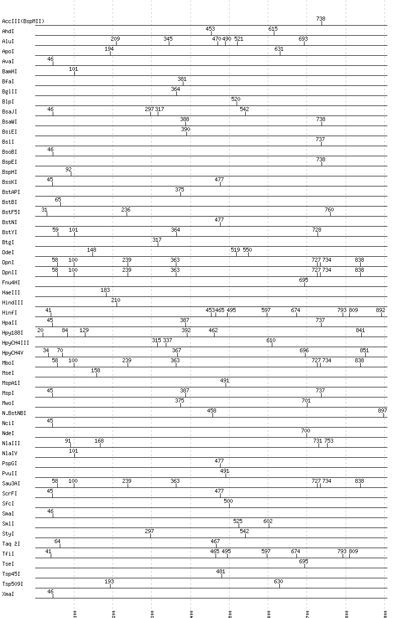 Uncut enzymes: AatII, Acc65I, AccI, AccII(FnuDII), AciI, AclI, AfeI, AflII, AflIII, AgeI, AlwI, AlwNI, Aor51HI(Eco47III), ApaI, ApaLI, AscI, AseI, AvaII, AvrII, BaeI, BalI, BanI, BanII, BbsI, BbvCI, BbvI, BcgI, BciVI, BclI, BglI, BmrI, BpmI, BsaAI, BsaBI, BsaHI, BsaI, BsaXI, BseRI, BsgI, BsiHKAI, BsiWI, BsmAI, BsmBI, BsmFI, BsmI, Bsp1286I, BspDI, BspMI, BspT107I(HgiCI), BsrBI, BsrDI, BsrFI, BsrGI, BsrI, BssHII, BssSI, BstEII, BstUI, BstXI, BstZ17I, Bsu36I, BtrI, BtsI, Cac8I, Cfr10I, ClaI, DraI, DraIII, DrdI, EaeI, EagI, EarI, EciI, EcoNI, EcoO109I, EcoRI, EcoRV, FauI, FokI, FseI, FspI, HaeII, HgaI, HhaI, HinP1I, HincII, HpaI, HphI, Hpy99I, HpyCH4IV, I-CeuI, I-SceI, KasI, KpnI, MboII, MfeI, MluI, MlyI, MnlI, MscI, MslI, NaeI, , NarI, NcoI, NgoMIV, NheI, NotI, NruI, NsiI, NspI, PI-PspI, PI-SceI(VDE), PacI, PaeR7I, PciI, PflFI, PflMI, PleI, PmeI, PmlI, PpuMI, PshAI, PsiI, PspOMI, PstI, PvuI, RsaI, RsrII, SacI, SacII, SalI, SapI, Sau96I, SbfI, ScaI, SexAI, SfaNI, SfiI, SfoI, SgrAI, SnaBI, SpeI, SphI, SspI, StuI, SwaI, TliI, TspRI, Tth111I, XbaI, XcmI, XhoI, XmnI