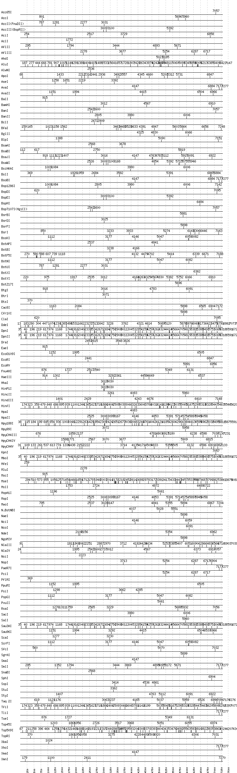 Uncut enzymes: AatII, AfeI, AgeI, AlwI, Aor51HI(Eco47III), ApaI, ApaLI, AscI, AvrII, BaeI, BbsI, BbvCI, BbvI, BcgI, BciVI, BglI, BmrI, BpmI, BsaHI, BsaI, BsaXI, BseRI, BsgI, BsiEI, BsiWI, BsmAI, BsmBI, BsmFI, BsmI, BspMI, BsrGI, BssHII, BssSI, BstEII, Bsu36I, DraIII, DrdI, EagI, EarI, EciI, EcoNI, FauI, FokI, FseI, FspI, HaeII, HgaI, HphI, I-CeuI, I-SceI, KasI, MboII, MlyI, MnlI, , NarI, NheI, NotI, NruI, PI-PspI, PI-SceI(VDE), PacI, PflFI, PleI, PmeI, PmlI, PshAI, PspOMI, PstI, PvuI, RsrII, SacII, SapI, SbfI, SexAI, SfaNI, SfiI, SfoI, SpeI, SwaI, Tth111I, XcmI