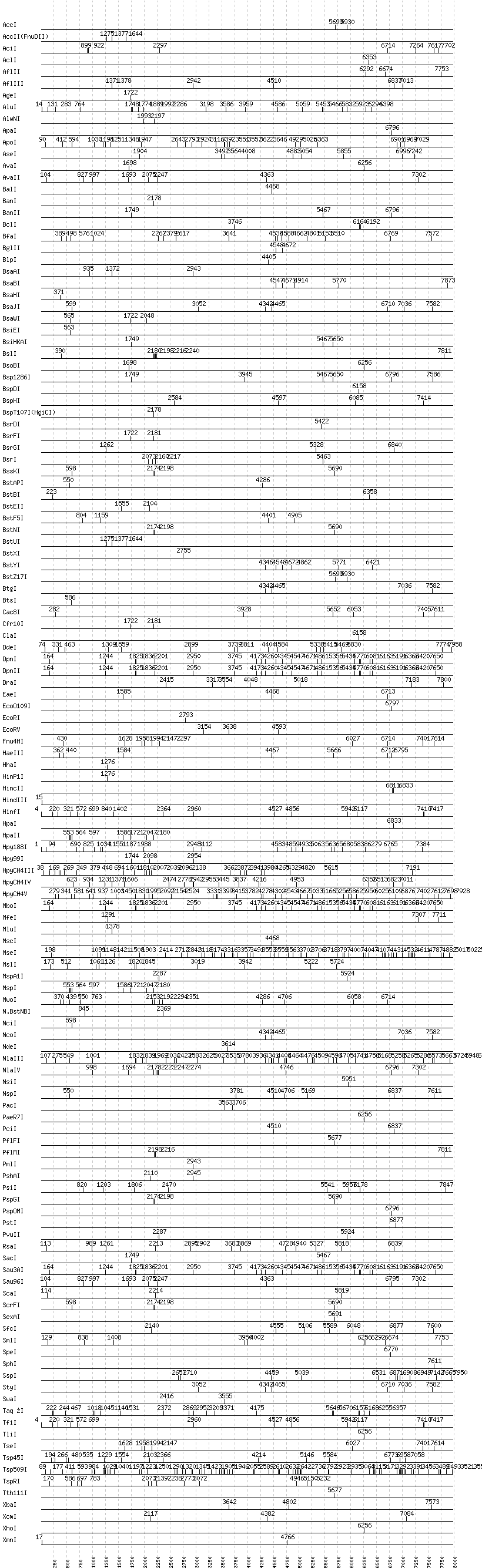 Uncut enzymes: AatII, Acc65I, AccIII(BspMII), AfeI, AhdI, AlwI, Aor51HI(Eco47III), ApaLI, AscI, AvrII, BaeI, BamHI, BbsI, BbvCI, BbvI, BcgI, BciVI, BglI, BmrI, BpmI, BsaI, BsaXI, BseRI, BsgI, BsiWI, BsmAI, BsmBI, BsmFI, BsmI, BspEI, BspMI, BsrBI, BssHII, BssSI, Bsu36I, BtrI, DraIII, DrdI, EagI, EarI, EciI, EcoNI, FauI, FokI, FseI, FspI, HaeII, HgaI, HphI, I-CeuI, I-SceI, KasI, KpnI, MboII, MlyI, MnlI, NaeI, , NarI, NgoMIV, NheI, NotI, NruI, PI-PspI, PI-SceI(VDE), PleI, PmeI, PpuMI, PvuI, RsrII, SacII, SalI, SapI, SbfI, SfaNI, SfiI, SfoI, SgrAI, SmaI, SnaBI, StuI, XmaI